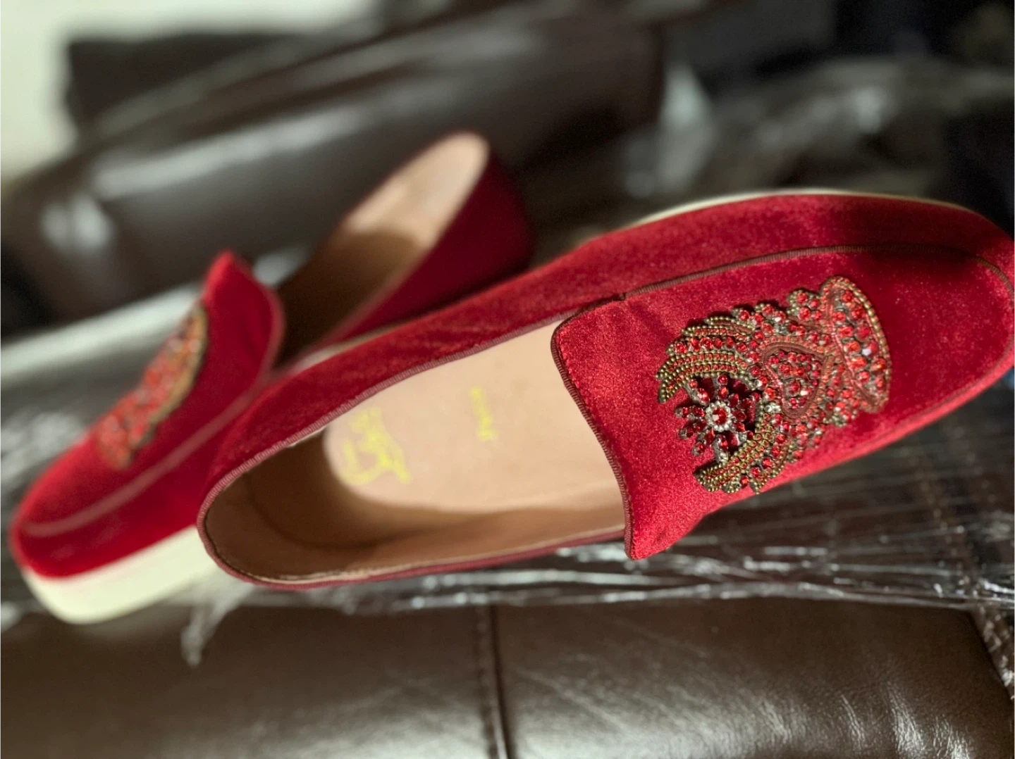 10These are a pair of stylish Christian Louboutin loafers in a beautiful red velvet material! They feature unique beaded embellishments on the top. The soles show some signs of wear, but they're still in great shape for strutting around town!