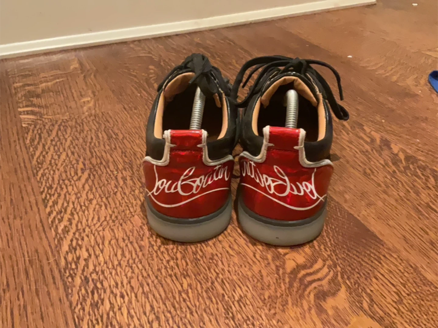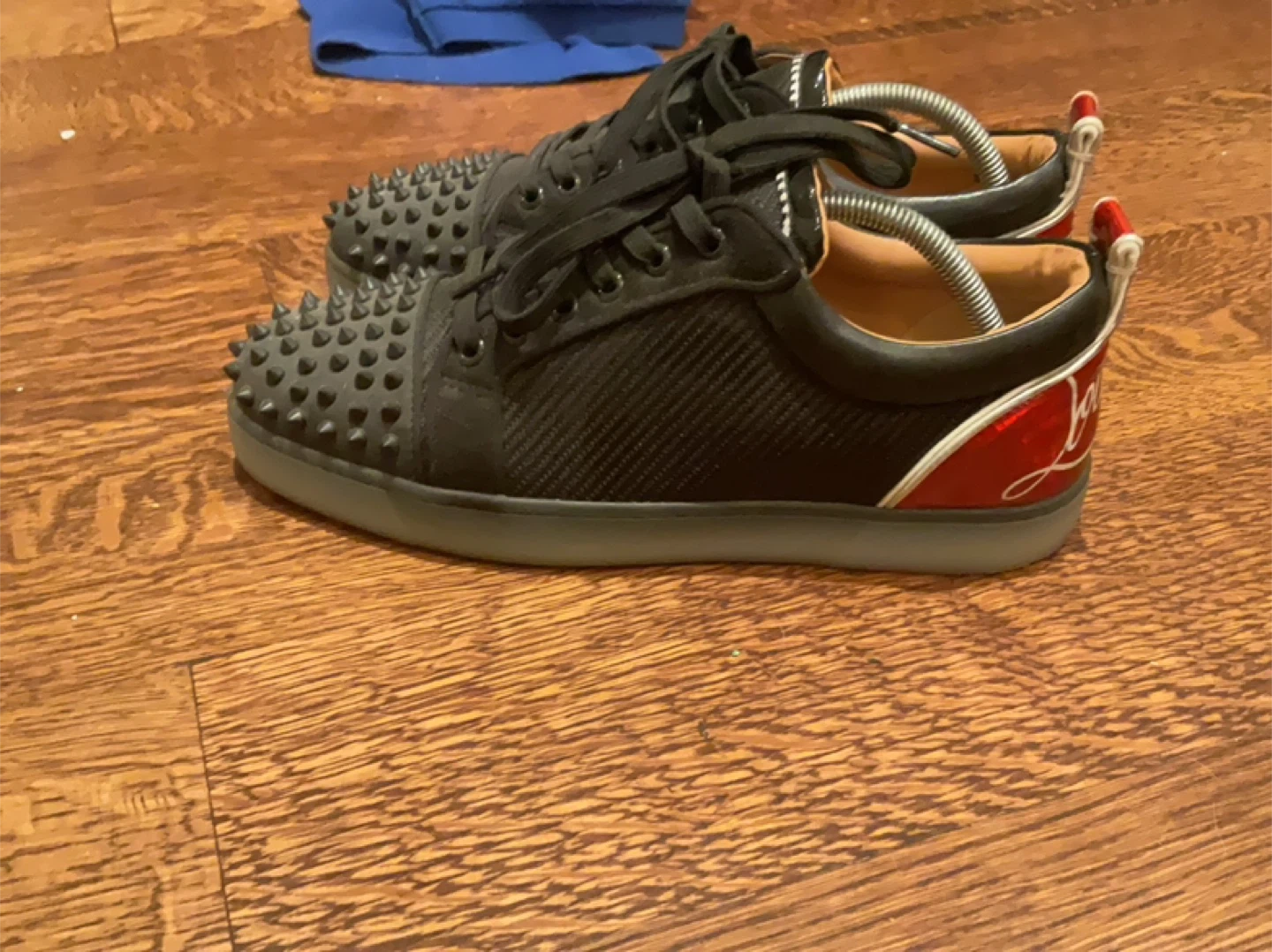 Selling a pair of Christian Louboutin sneakers. They feature the signature Louboutin script on the back and the iconic spiked design on the front. These stylish sneakers are sure to turn heads!