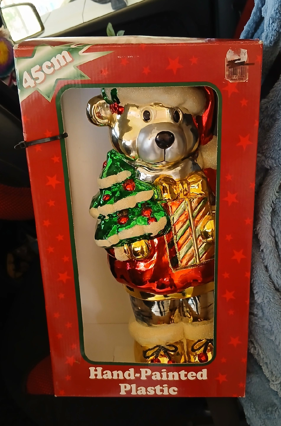 Add a touch of holiday cheer with this adorable Christmas bear figurine! It's 45cm tall and hand-painted, made of plastic. The bear is holding a Christmas tree and a gift, perfect for decorating your home for the festive season