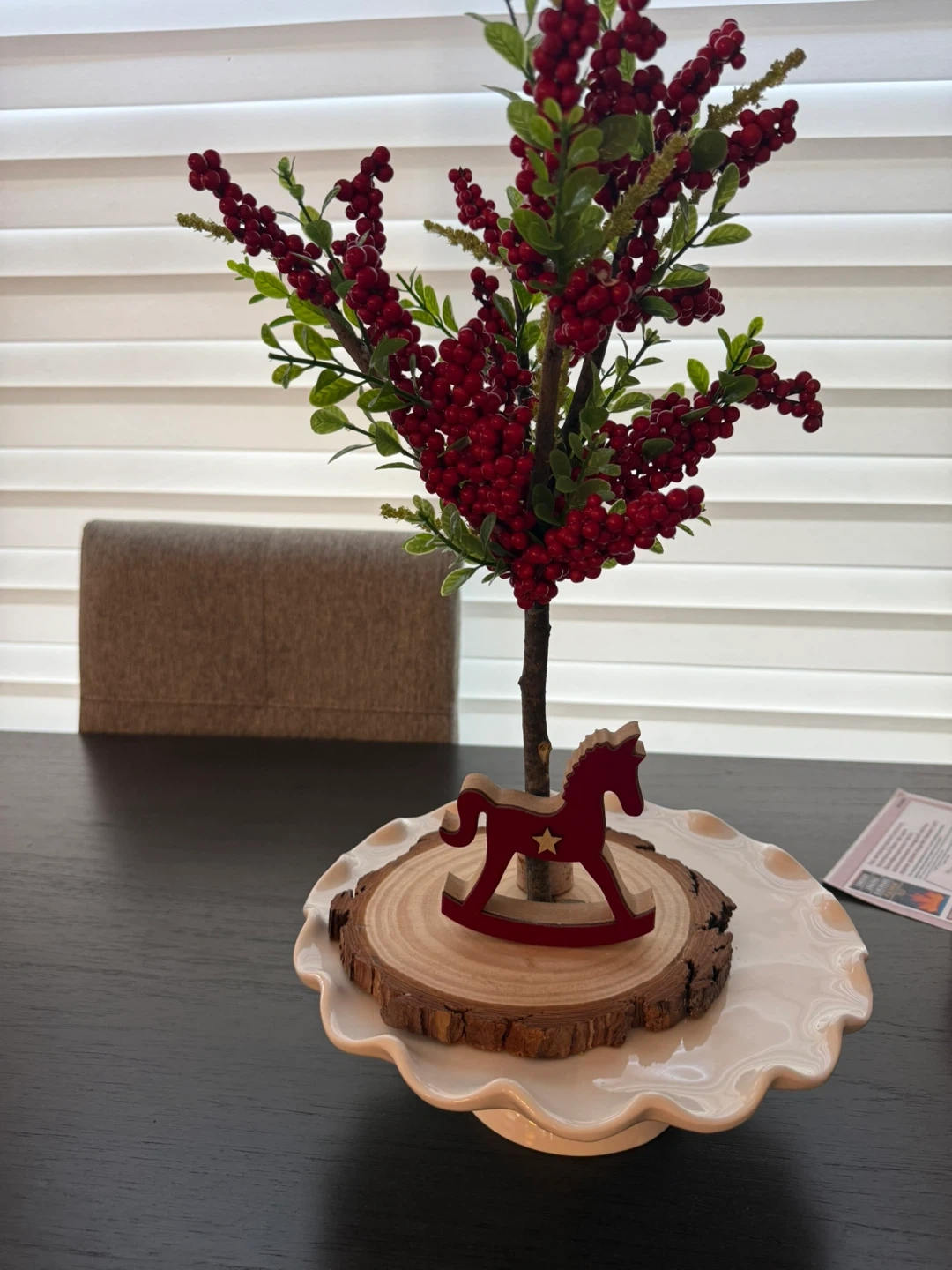 75Cute Christmas berry tree with a little wooden rocking horse on a wood slice base! Perfect for adding a touch of holiday cheer to your home