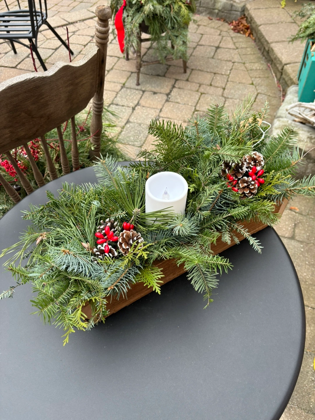 5Red pine Wooden table centrepiece with fresh cut greenery. Includes a white pillar candle, red berries and pine cones. Great Christmas gift or for your table this Christmas. Last one available.