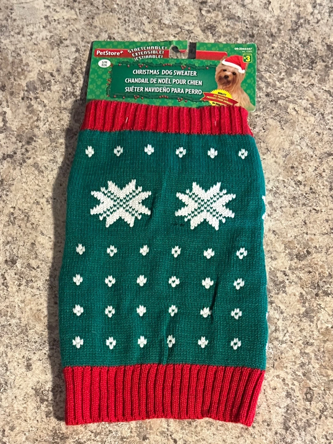 61Adorable PetStore Christmas dog sweater! It's a size small and features a classic holiday design. The sweater is stretchable and extensible for a comfy fit. CASH ONLY PICK UP ONLY