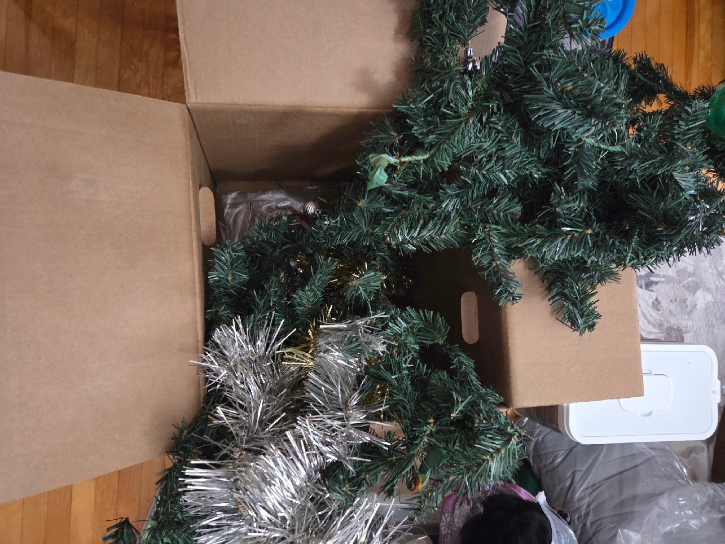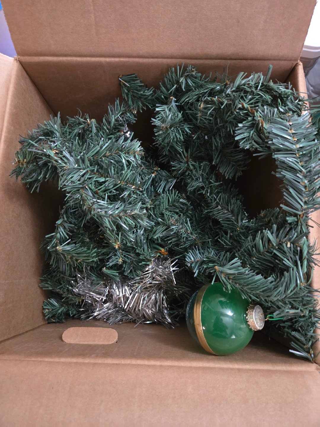83Selling two 4 foot lengths of Christmas garland, complete with some ornaments and tinsel, all packed up in a box! Ready to bring some holiday cheer to your home. This has been used outside on the door.