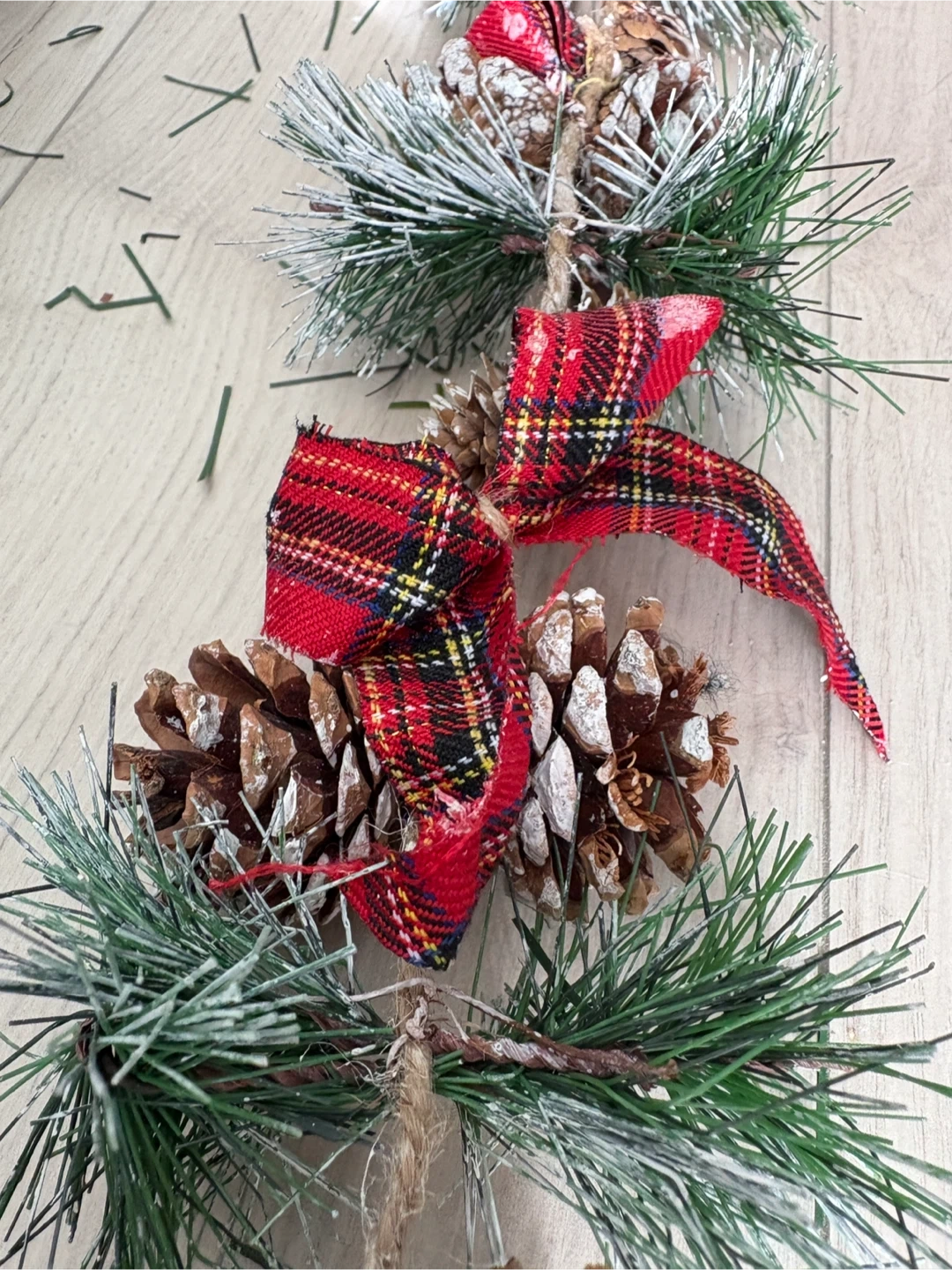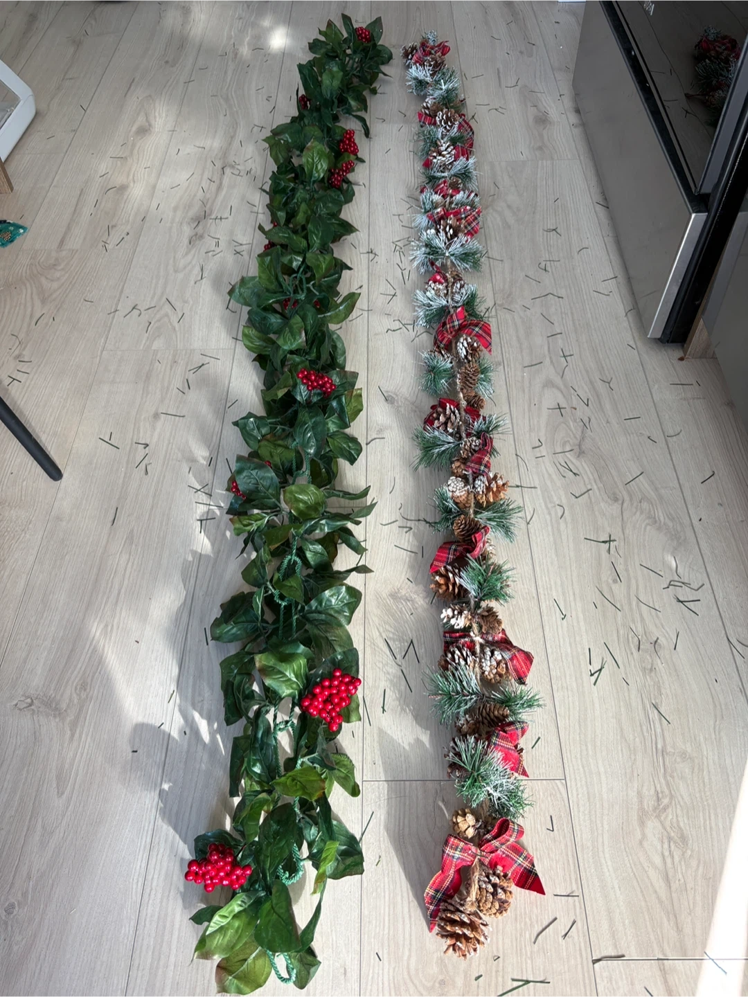 94Two lovely Christmas garlands to add some festive cheer to your home! One is a lush green with bright red berries, and the other is a snowy pine garland adorned with pinecones and tartan bows. Perfect for decorating your mantelpiece or staircase this holiday season