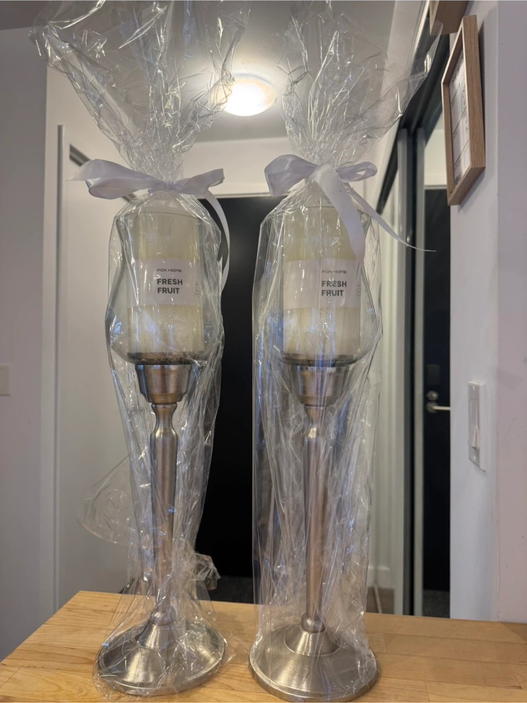 Selling New - wrapped - two PC Silver stands with Home Fresh Fruit scented candles from Fox Home - original price is 150 A very chic Christmas Gift