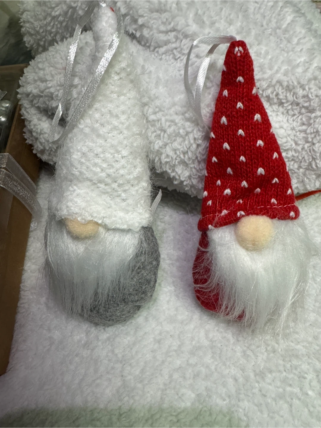 78Selling a cute set of two Christmas gnome ornaments! One is white and grey, and the other is red and white. They're perfect for adding a touch of whimsy to your holiday decor $8 for 1 $12 for 2