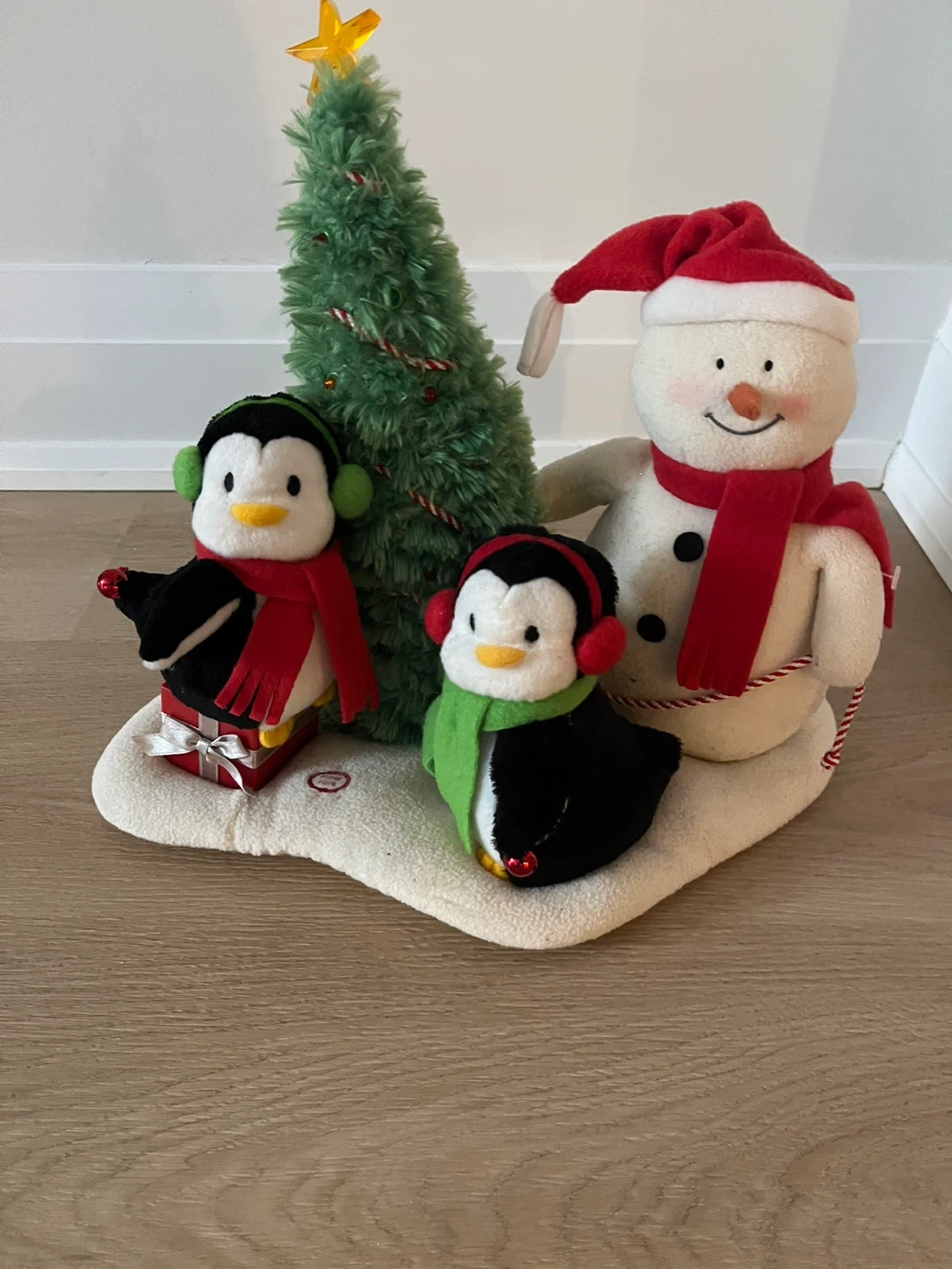 93A cute plush Christmas decoration featuring a snowman, two penguins, and a Christmas tree! Perfect for adding a festive touch to your home this holiday season