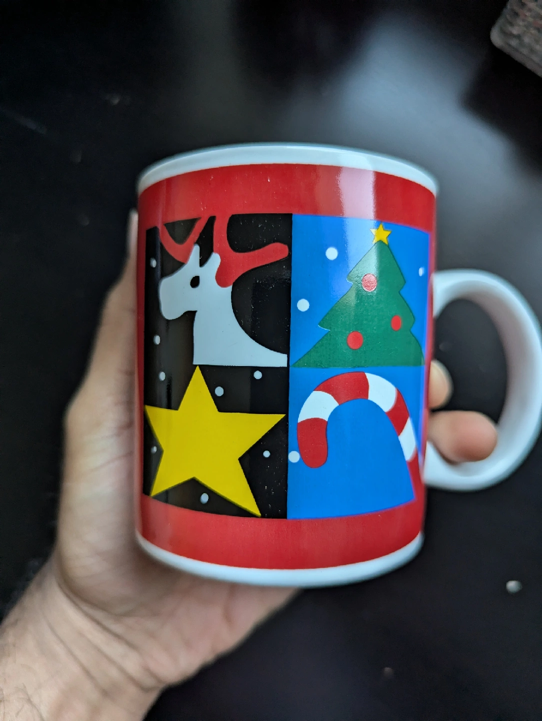 Festive Christmas mug featuring a reindeer, Christmas tree, star, and candy cane design! It's in great shape and ready to bring some holiday cheer to your morning coffee or hot chocolate Material : High Quality Ceramic Size: 11 OZ Dimensions: 3.2" * 3.7" Priced to clear. Thrifty Pick Available in bulk. Offer - 3 for the price of 2 (Buy two Get One for free)