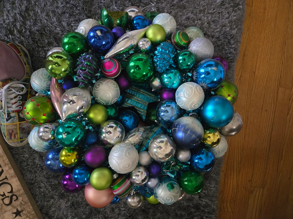 Selling a Christmas ornament wreath! It's got a variety of colours and textures, including shiny, matte, and patterned ornaments. It would be a great addition to your holiday decor