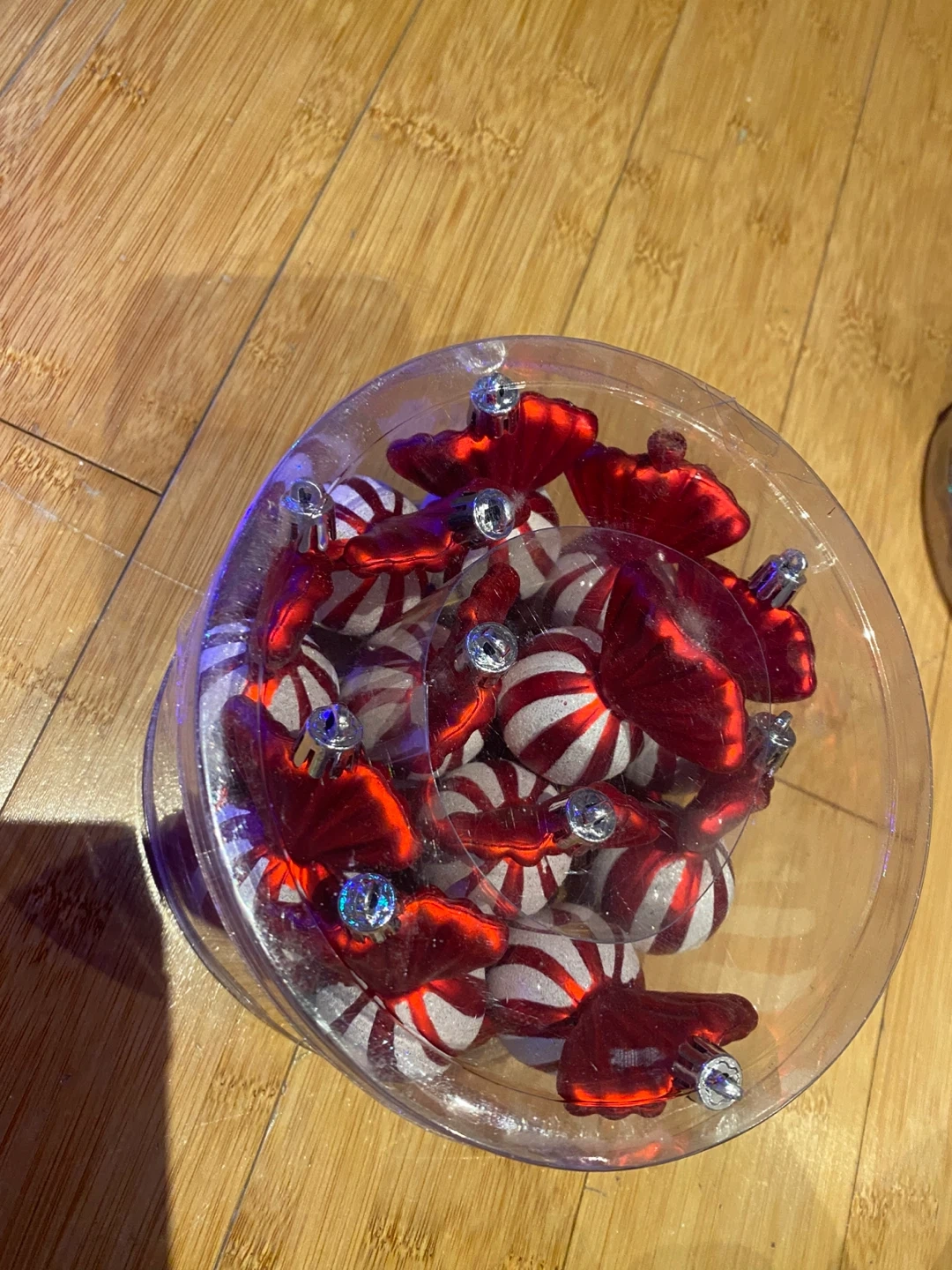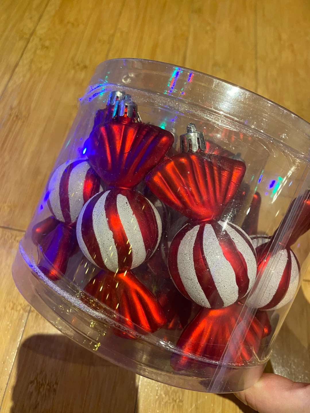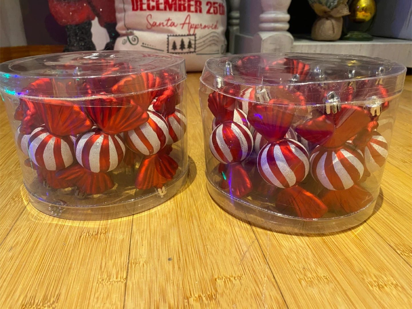 20Selling a set of red and white Christmas ornaments. They come in a clear plastic container, ready to add some festive cheer to your tree or holiday decor. New unopened