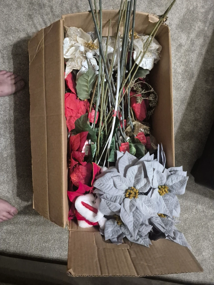 Selling a box of Christmas poinsettia floral arrangements. Includes red, white, and grey poinsettias with stems, ready to be arranged for your holiday decor. Also includes a small Santa figurine!