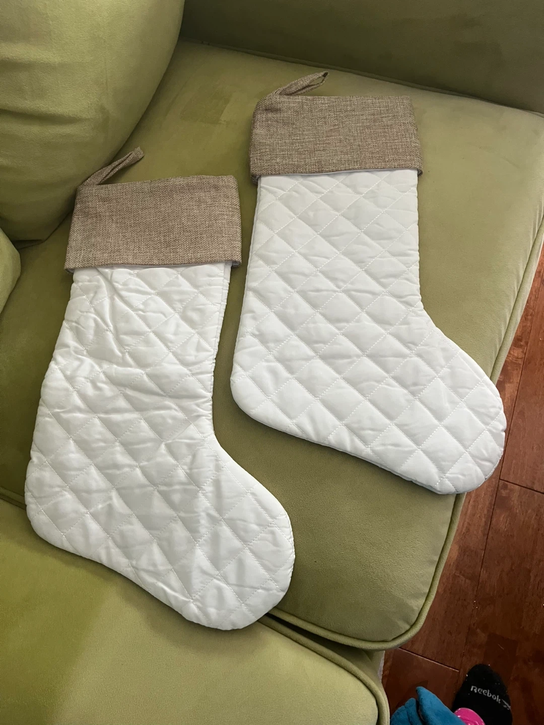 15Here's a set of two Christmas stockings! They're white with a quilted pattern and have a tan burlap cuff. Perfect for your holiday decorations