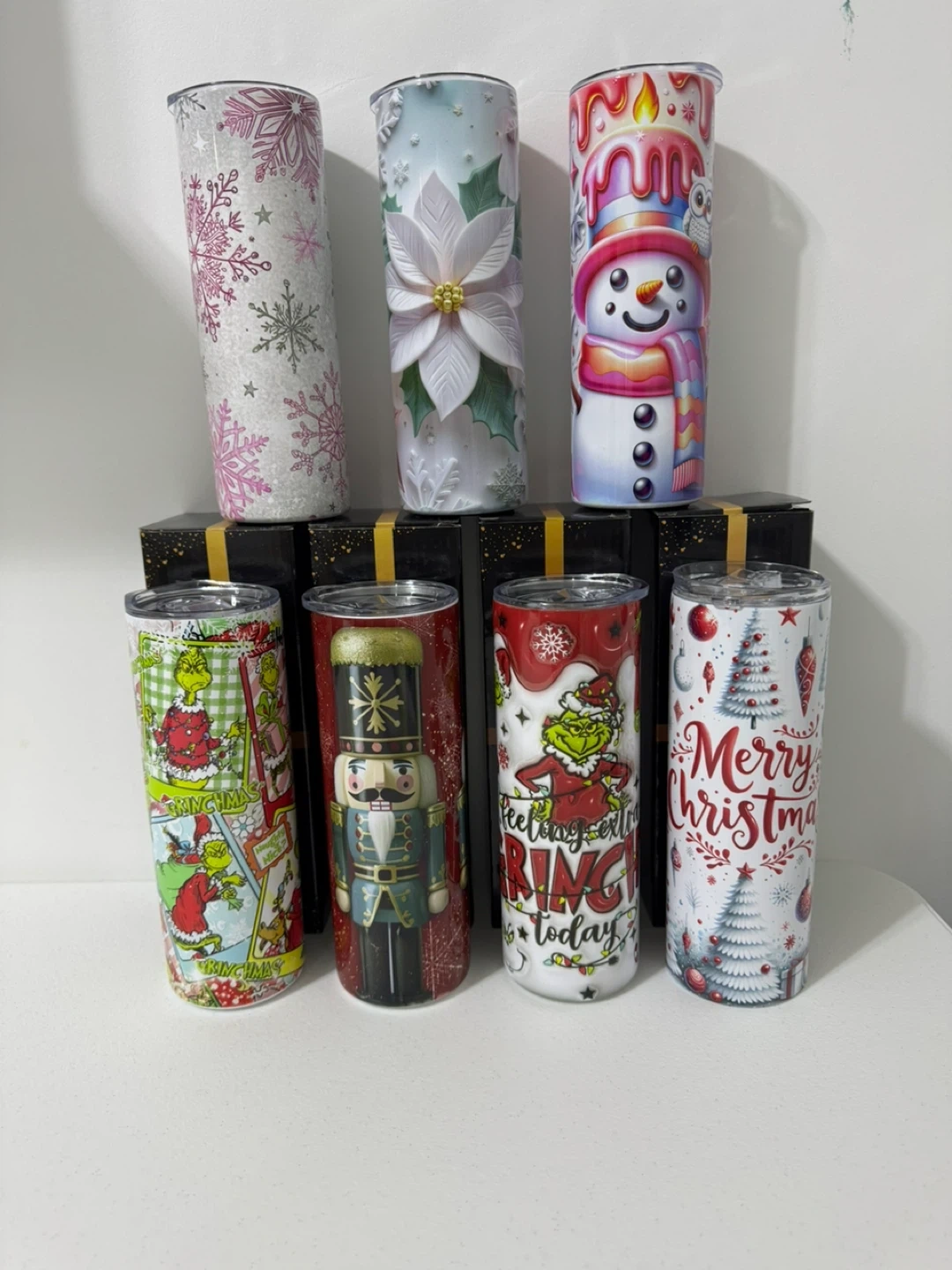 10Selling a collection of festive Christmas-themed tumblers! These are perfect for keeping your drinks hot or cold during the holiday season. Each tumbler features a unique design, including snowflakes, a snowman, a nutcracker, and the Grinch. They're in great condition and ready to bring some holiday cheer to your day!