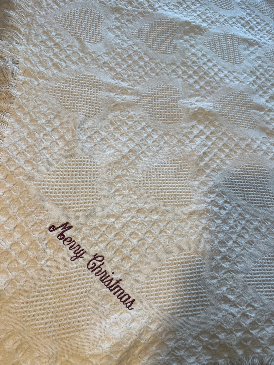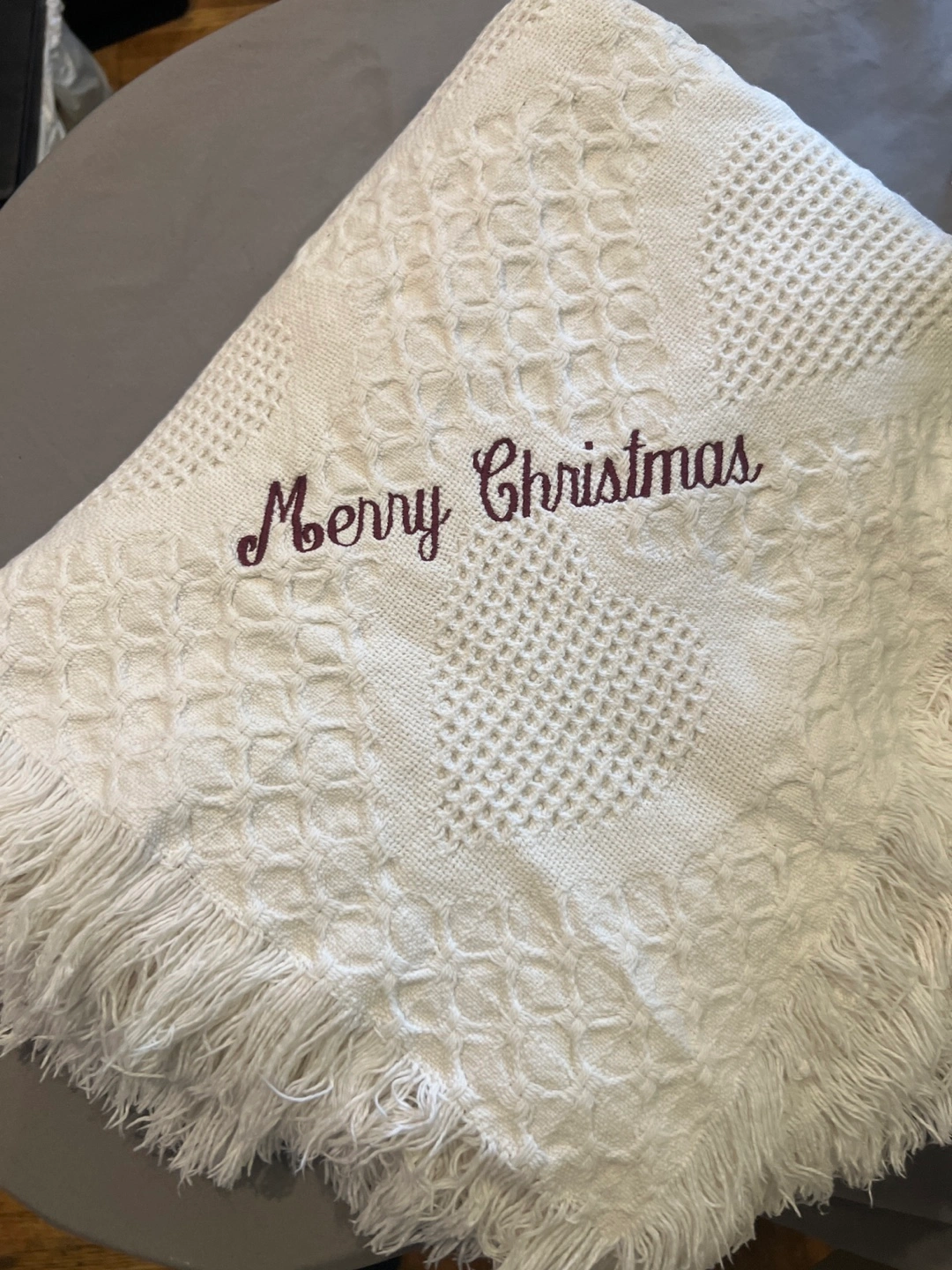 1000+Cozy throw blanket. Features a waffle-knit design. Embroidery says "Merry Christmas". Perfect for snuggling up on the couch during the holidays to enjoy a warm and comforting feeling.