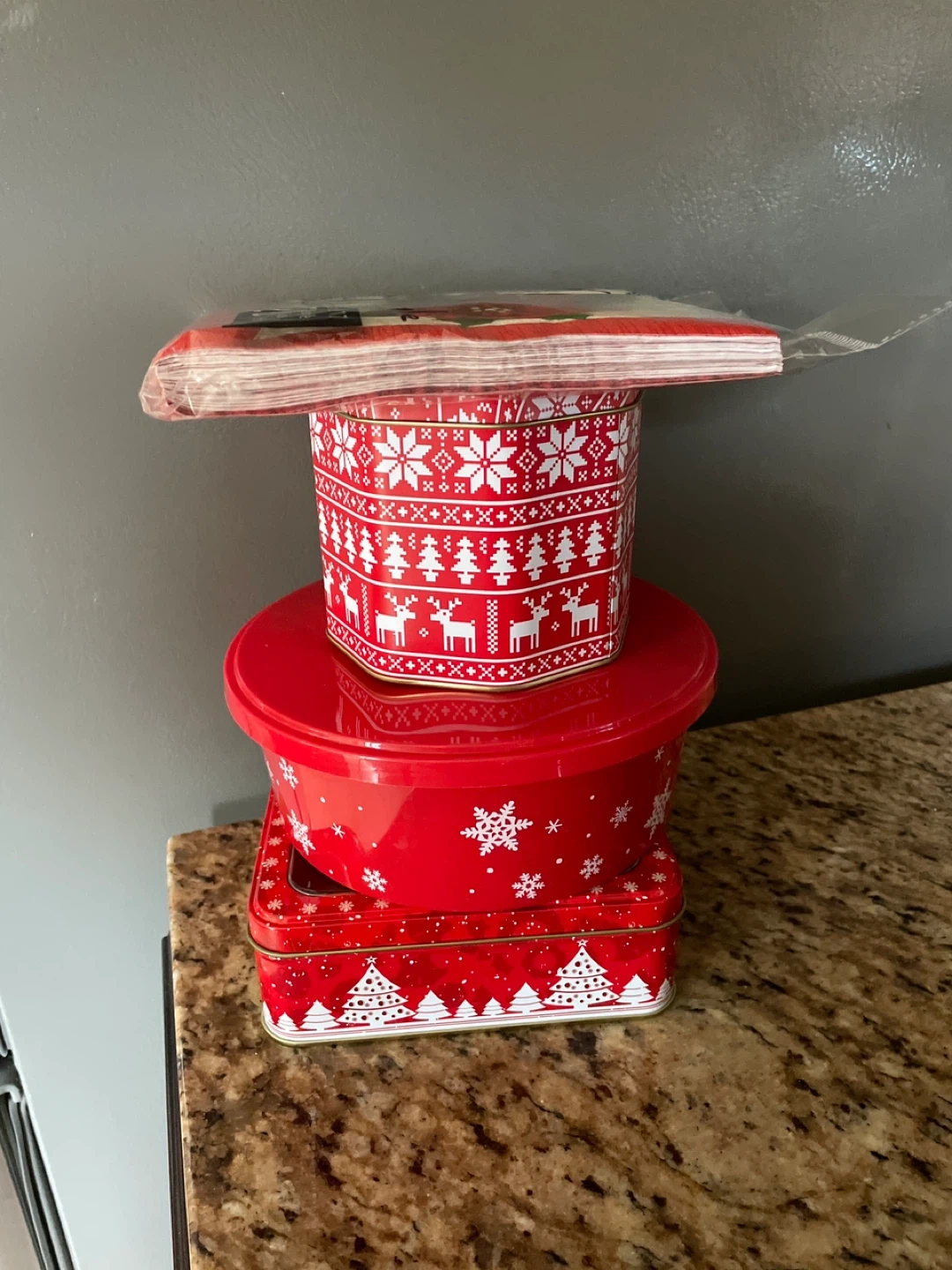 1000+Selling a set of Christmas-themed tins and napkins. There are three tins in various sizes and shapes, perfect for storing holiday treats or decorations. Also included is a pack of Life Style Excel lunch napkins, measuring 33 x 33 cm (13" x 13"), with 20 napkins in the pack
