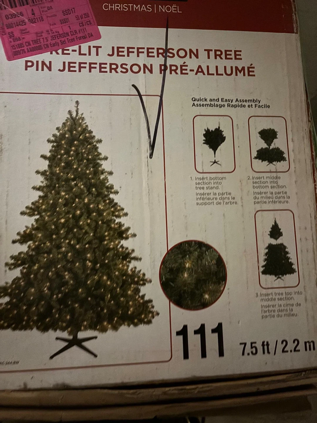 110Selling a pre-lit Jefferson Christmas tree! It's 7.5 ft tall or 2.2 meters. It features quick and easy assembly. Perfect for the upcoming holiday season. Ornaments are not included!