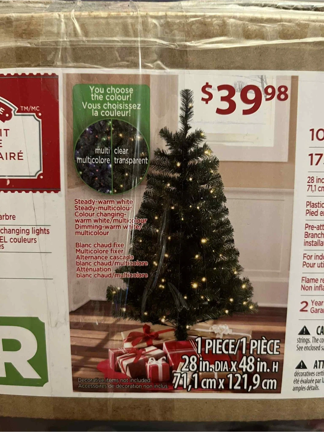 Get ready for the holidays with this 4ft Holiday Time pine tree! The pre lights don’t come with it. You have to put your own. Easy to set up and assemble. The tree is 28 inches in diameter and 48 inches in height. Originally bought for $39.98
