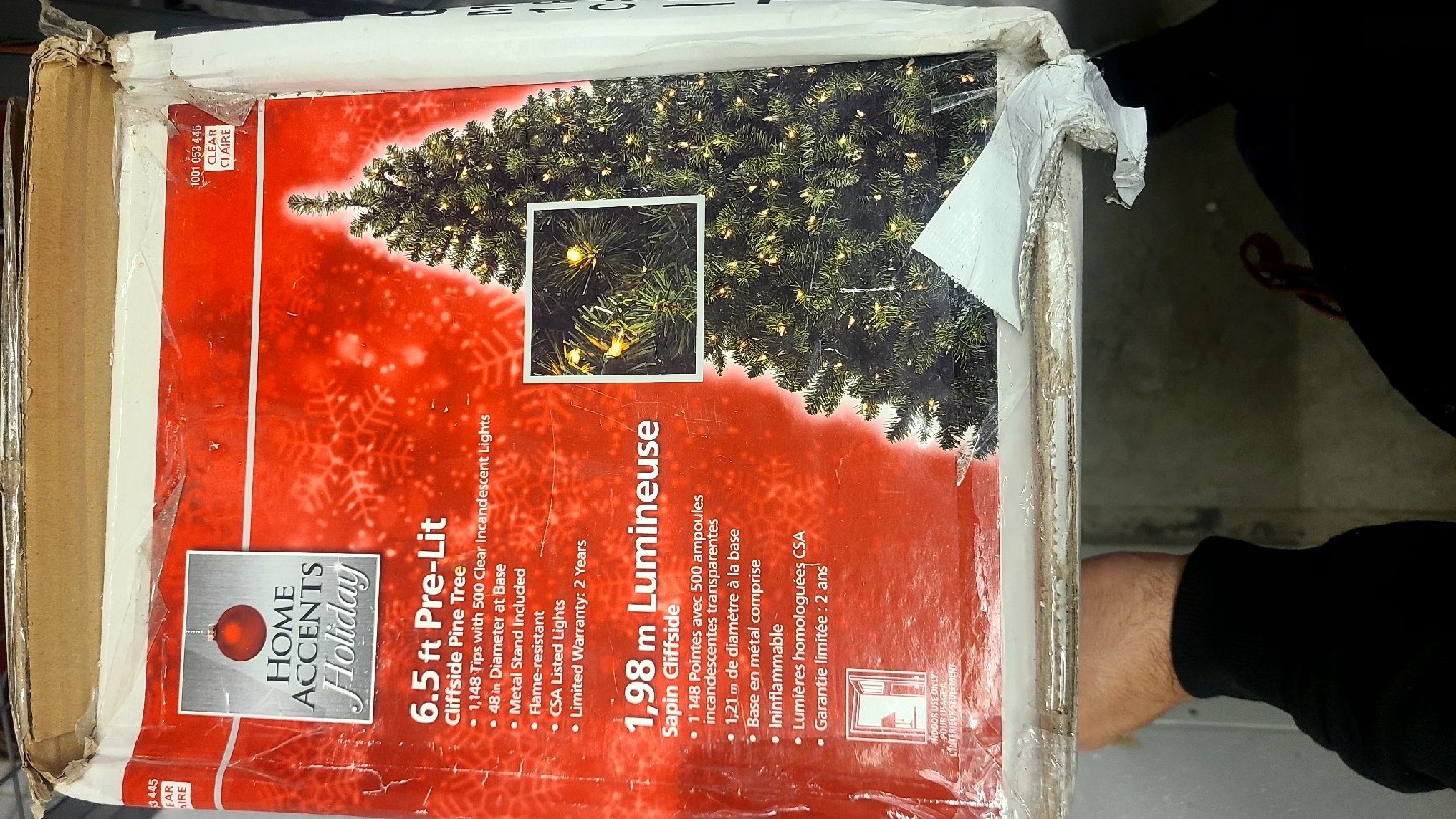 15Selling a Home Accents Holiday 6.5 ft Pre-Lit Christmas Tree. It features 1,148 Tips with 500 Clear Incandescent Lights and a 48-in Diameter at Base. It's also flame-resistant and comes with a limited 2-year warranty