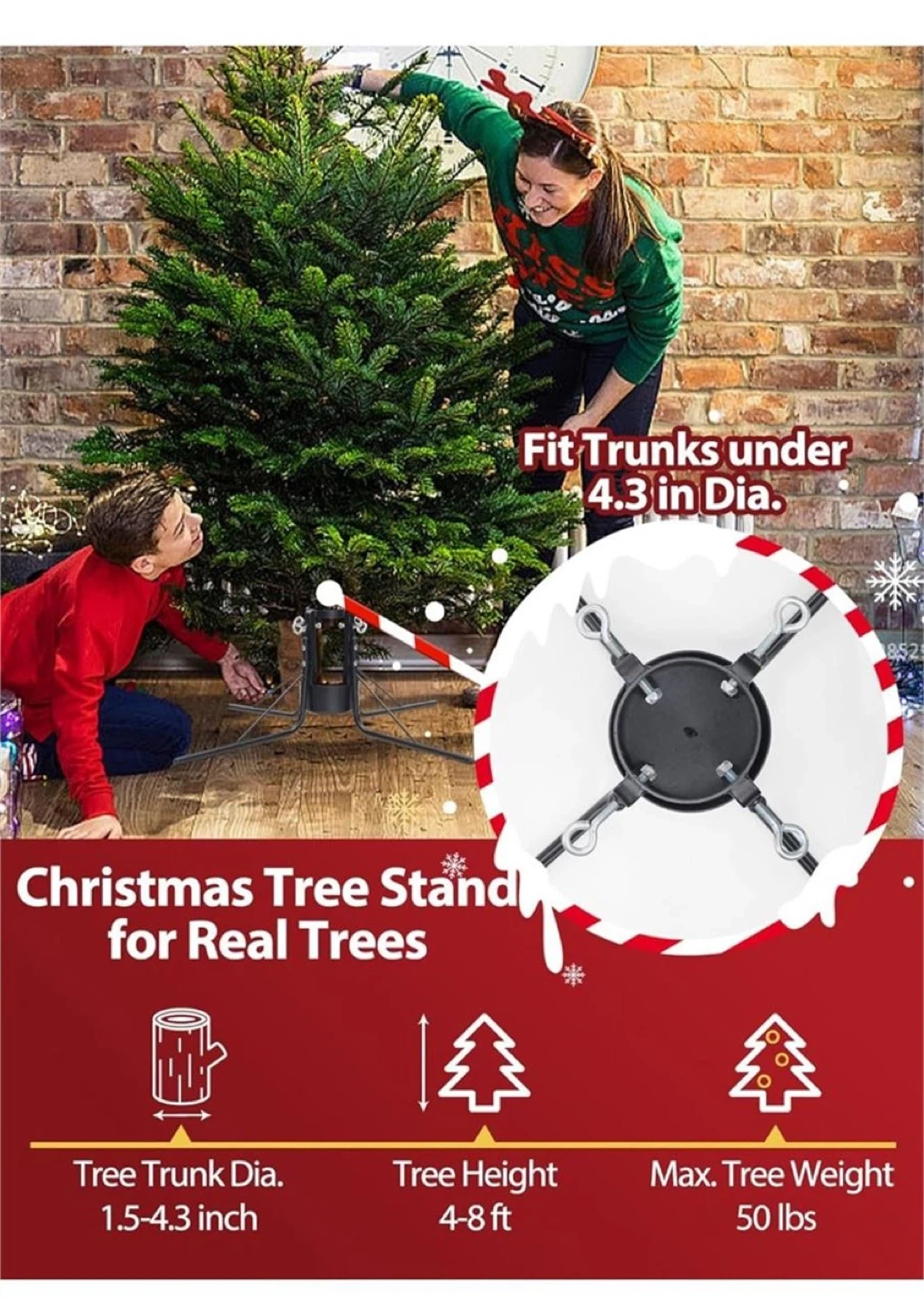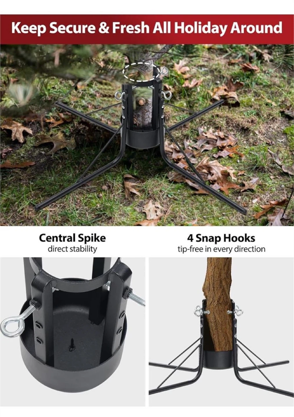 22Selling a brand new Christmas tree stand, still in its original box! It's designed for real trees and can fit trunks under 4.3 inches in diameter. It can handle trees between 4-8 ft tall, with a maximum tree weight of 50 lbs. It features a central spike for direct stability and 4 snap hooks for a tip-free experience in every direction. Great for keeping your tree secure and fresh all holiday around