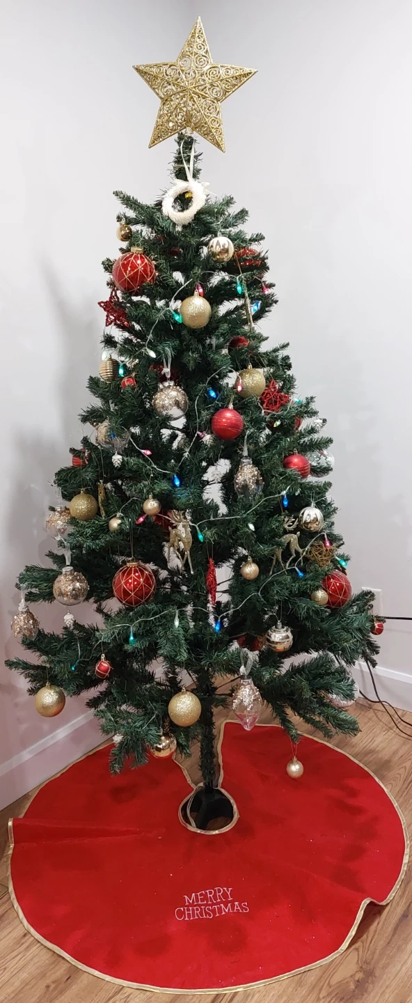 15Selling a fully decorated Christmas tree - 6 feet! It comes with all the ornaments you see in the pictures, including a star on top and a red tree skirt. It's ready to bring some holiday cheer to your home!