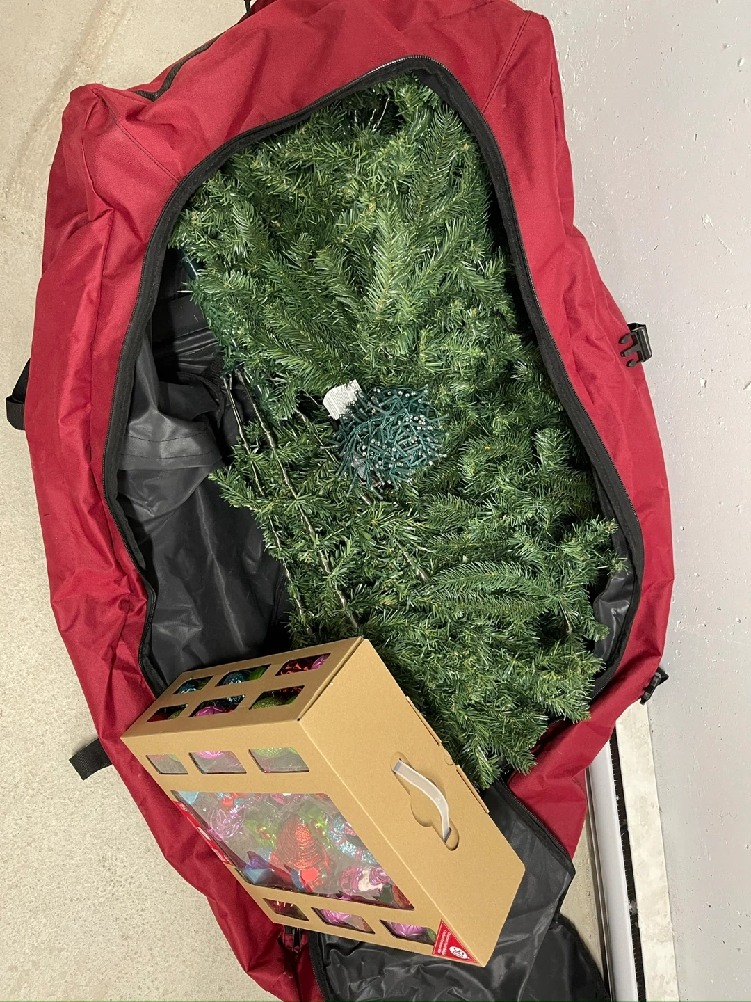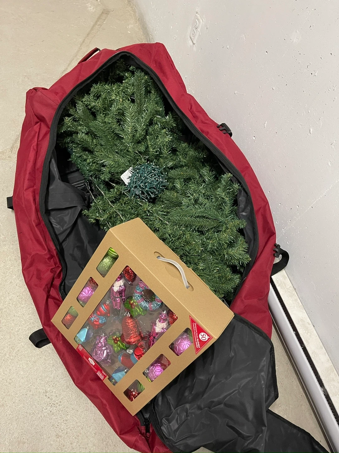 Selling a Christmas tree with ornaments, cool white led and a storage bag. The set includes the tree itself, a box of colorful ornaments, and a convenient storage bag for easy storage after the holidays. Everything you need to decorate for Christmas!