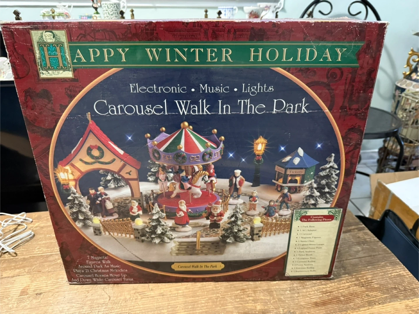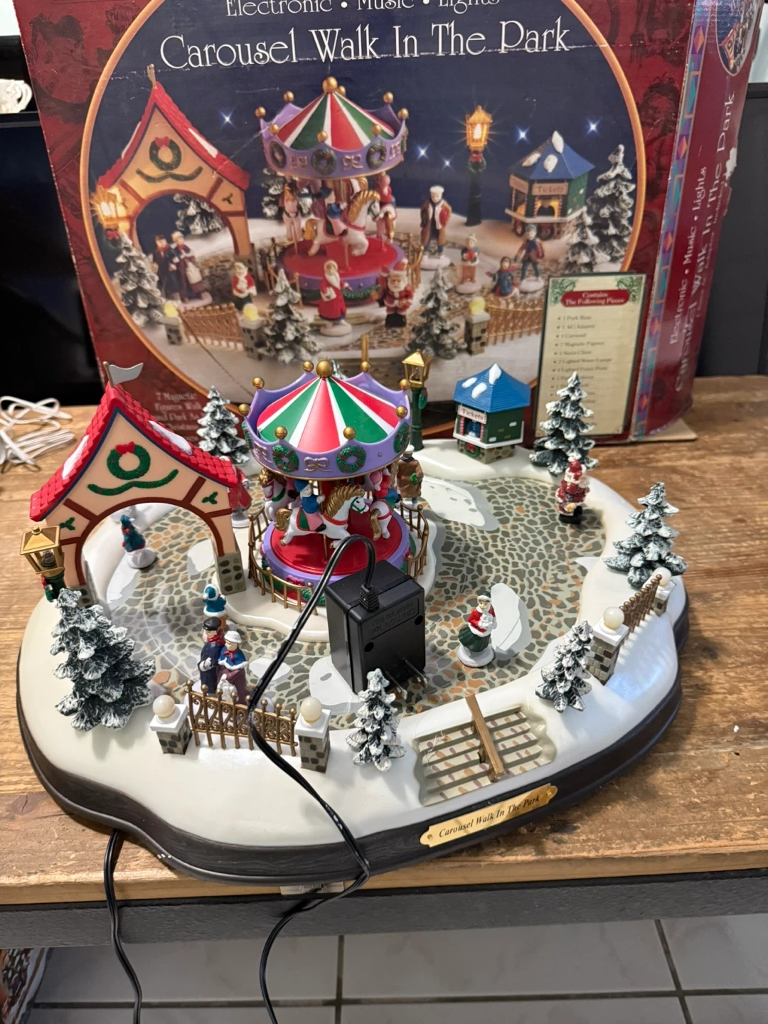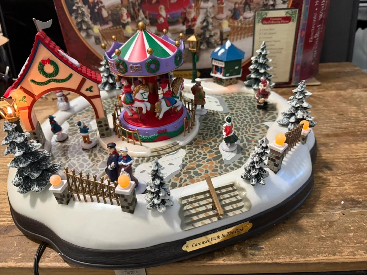 62Christmas village carousel electronic Happy winter holiday Carousel walk in the park Electronic music and lights Everything is working well