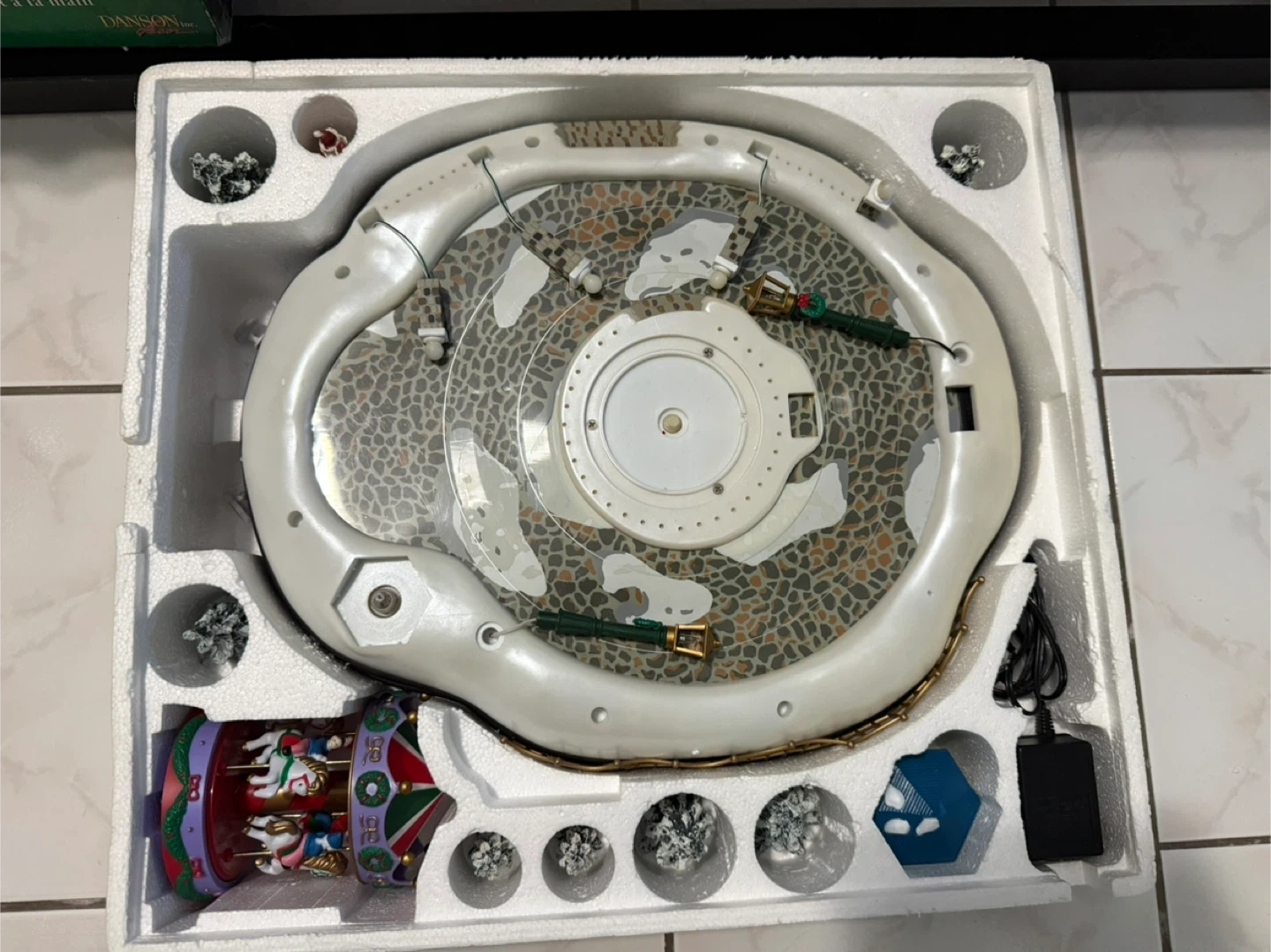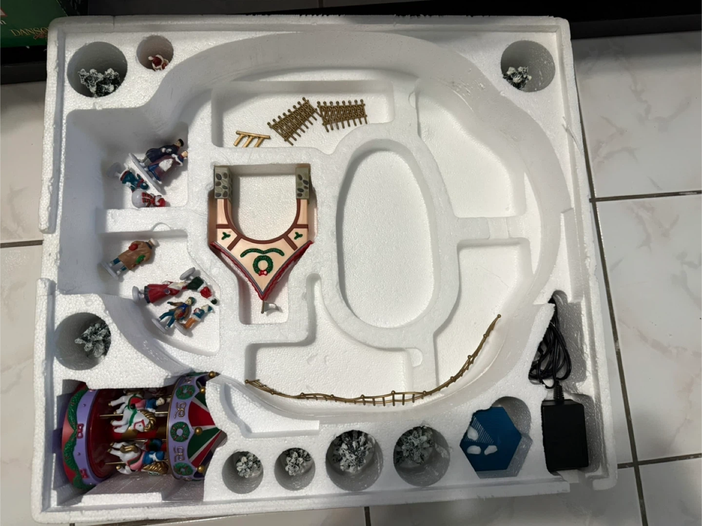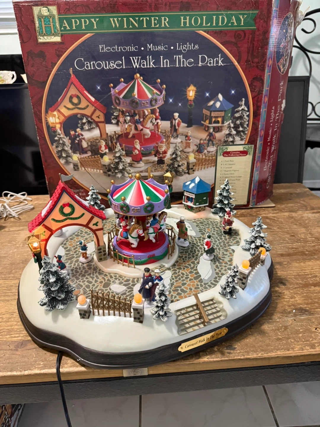 62Christmas village carousel electronic Happy winter holiday Carousel walk in the park Electronic music and lights Everything is working well