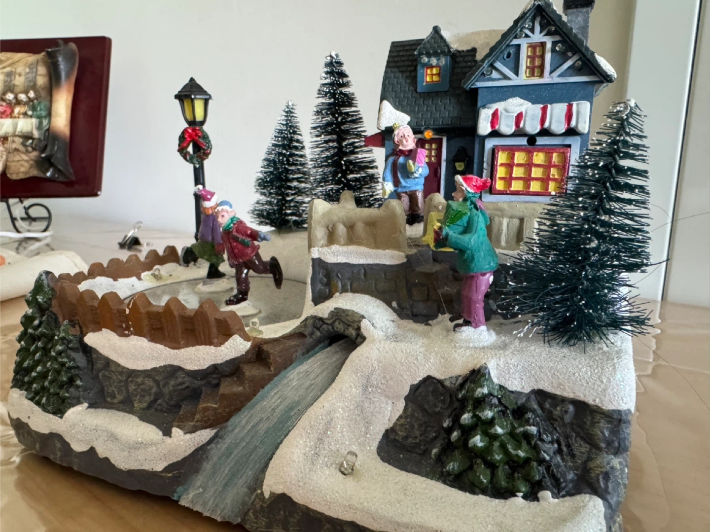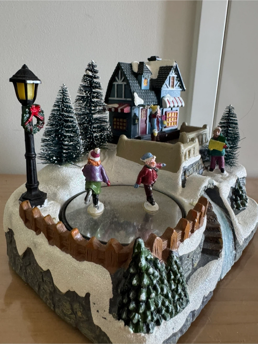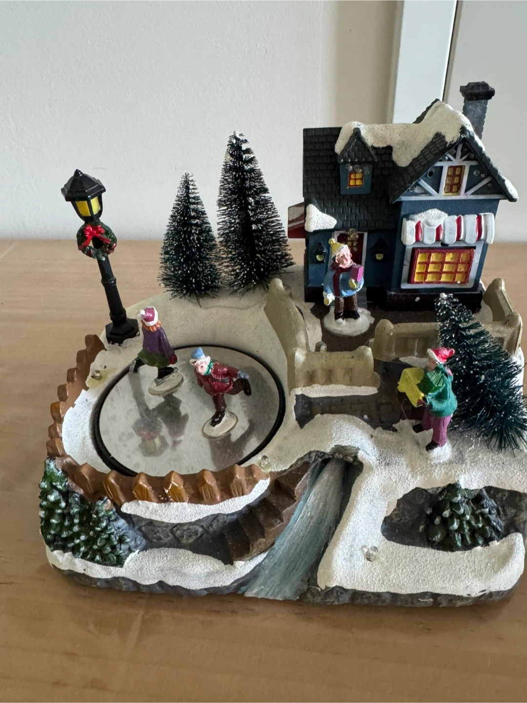 A charming Christmas village scene featuring ice skaters on a reflective surface. This decorative piece includes a house, figures, trees, and a water feature, all covered in snow, river fibre light. It's perfect for adding a festive touch to your Christmas decor, using 3 battery AA. Music and light Cash only please and pick up at Distillery loop streetcar stop