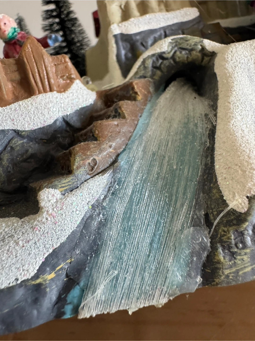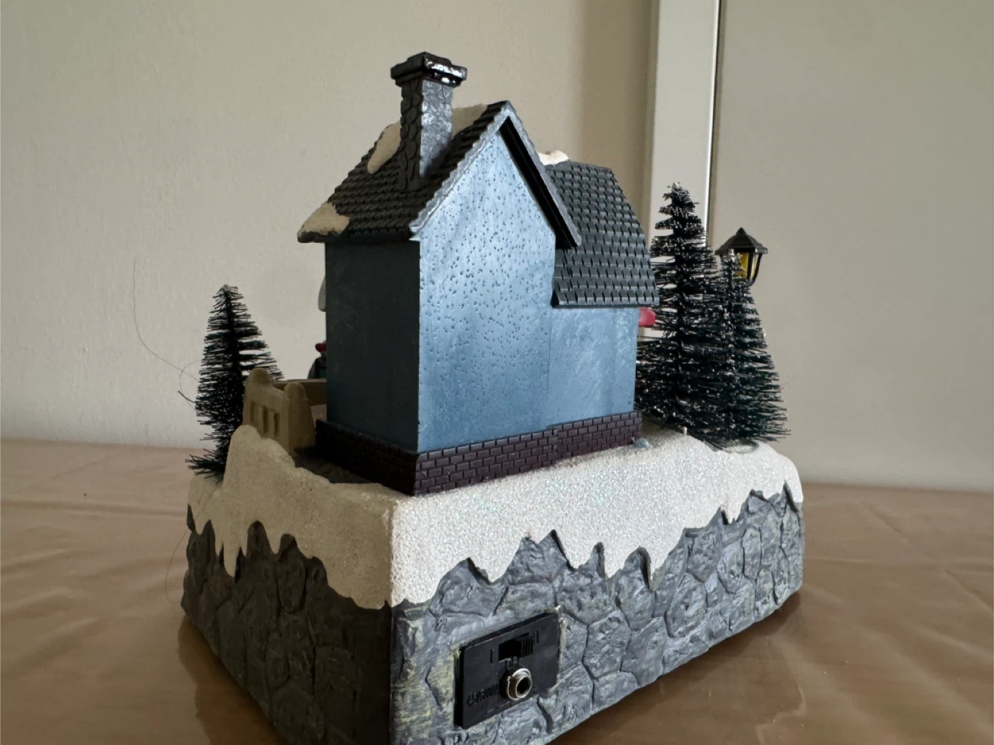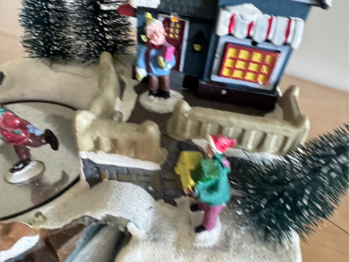 A charming Christmas village scene featuring ice skaters on a reflective surface. This decorative piece includes a house, figures, trees, and a water feature, all covered in snow, river fibre light. It's perfect for adding a festive touch to your Christmas decor, using 3 battery AA. Music and light Cash only please and pick up at Distillery loop streetcar stop