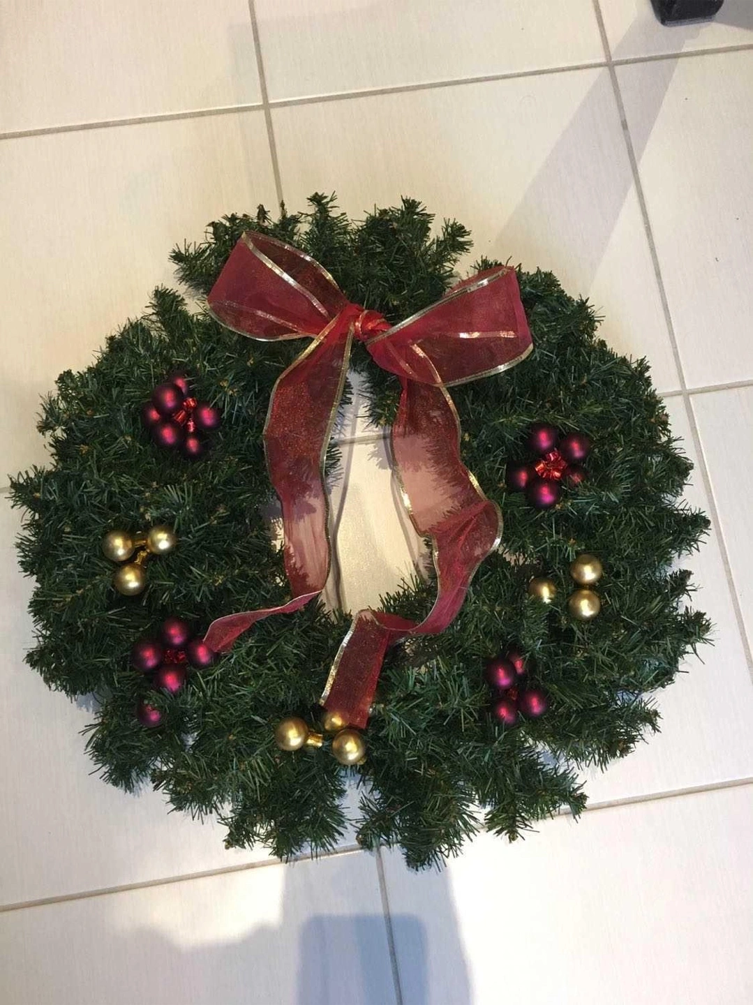 Festive Christmas wreath ready to bring holiday cheer to your home! It features a lush green base adorned with a red and gold-trimmed bow, plus red and gold ornaments. Perfect for adding a touch of seasonal sparkle to your door or wall