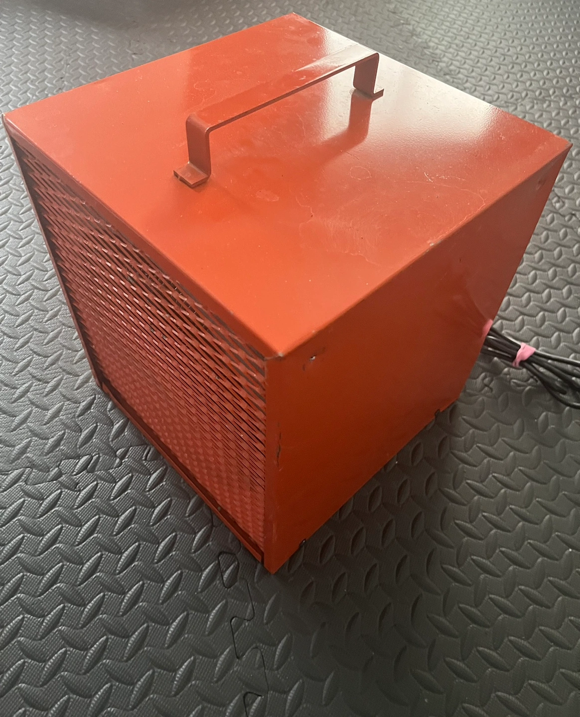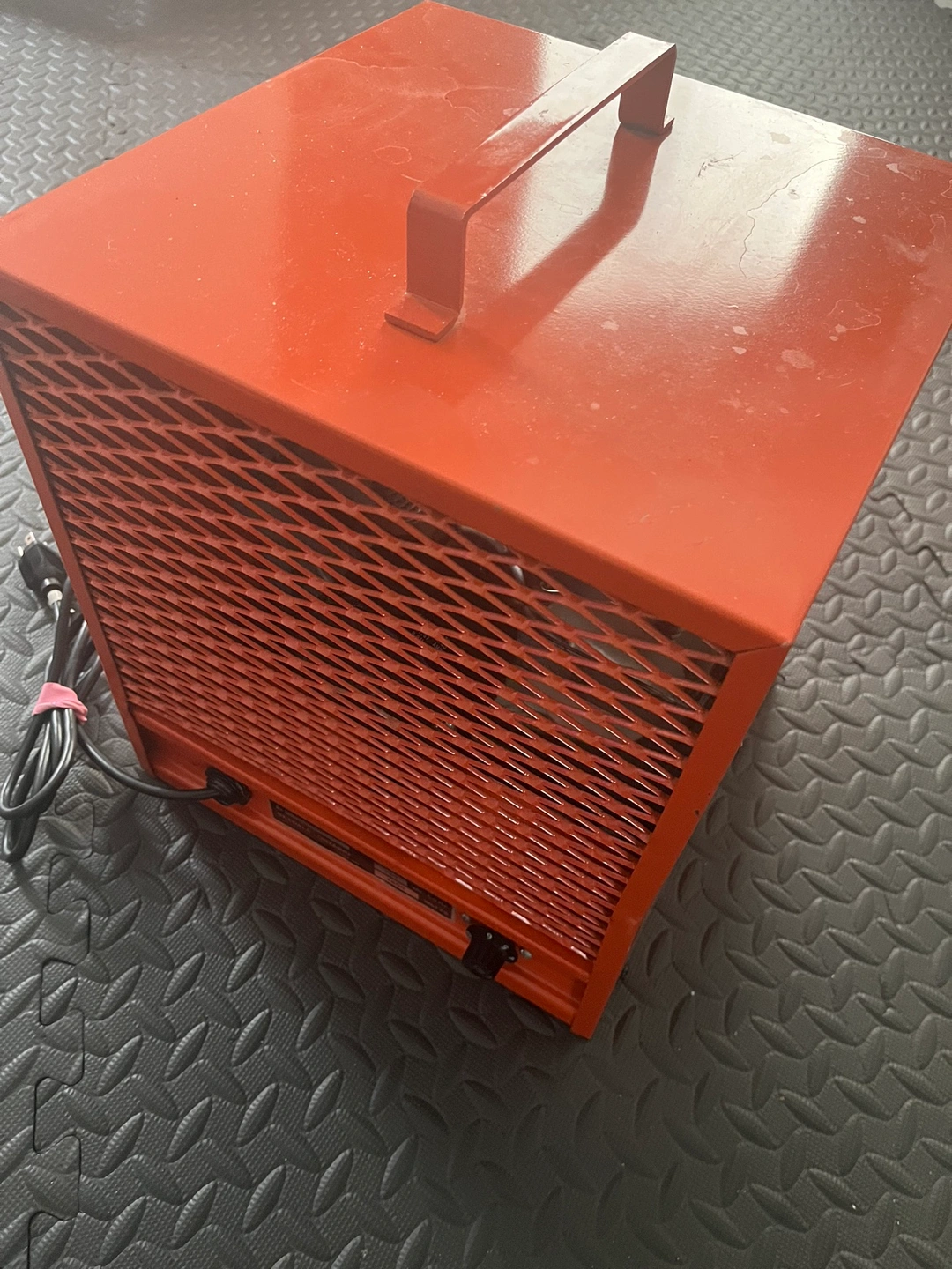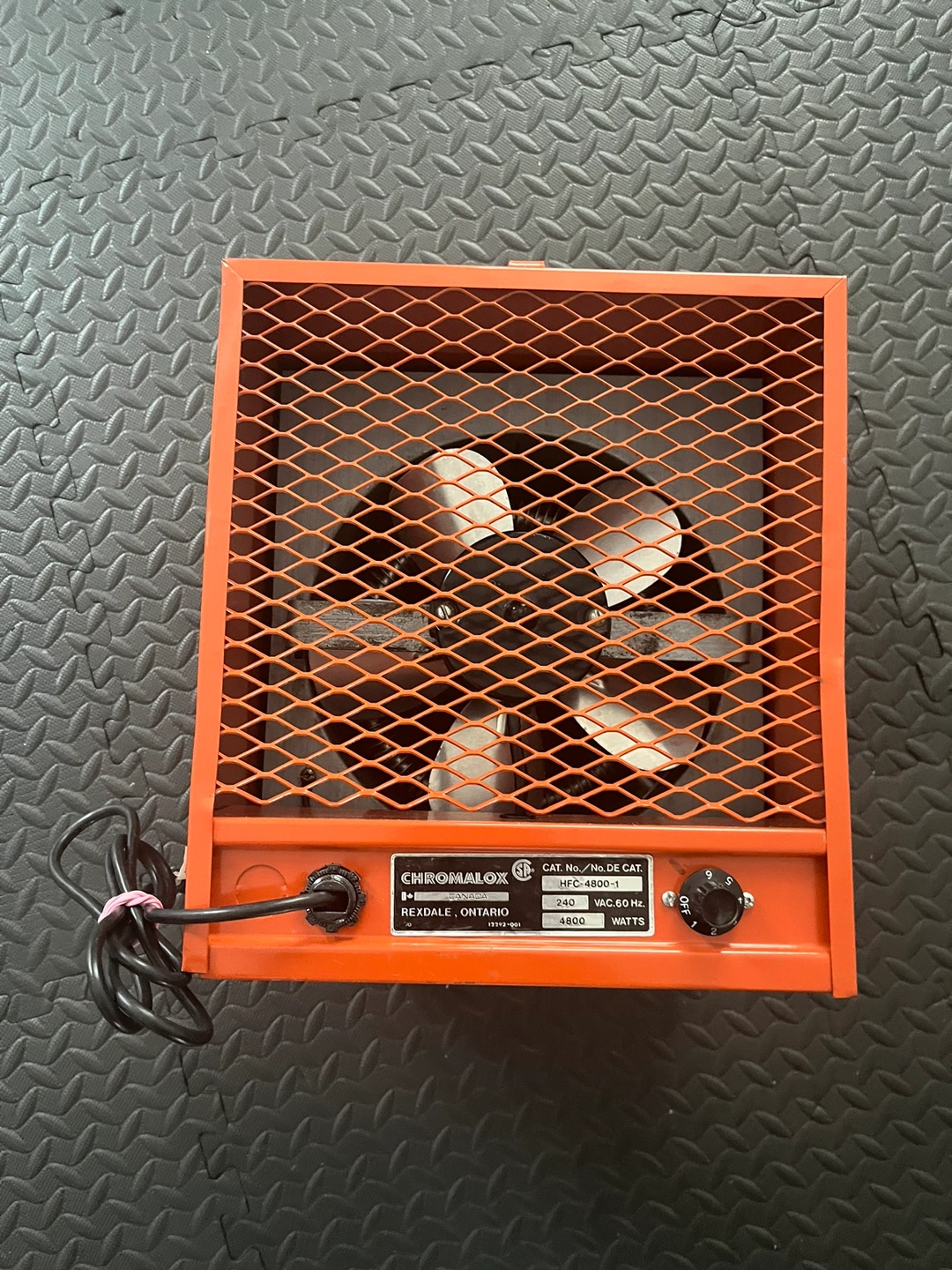 89This is a Chromalox electric heater in good working condition. It has a metal exterior and is portable with a built-in handle. It has a plug-in cord with heat/fan control on the front.