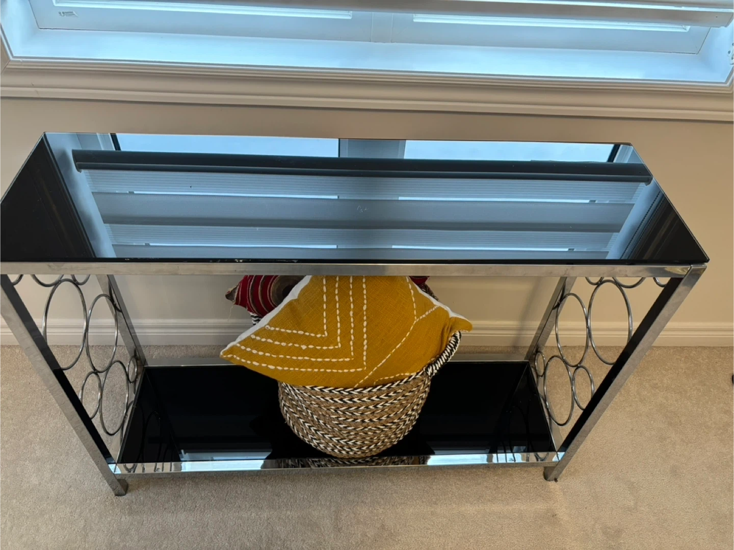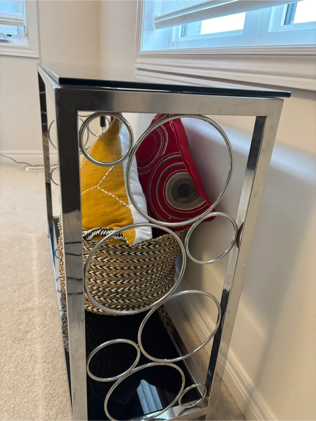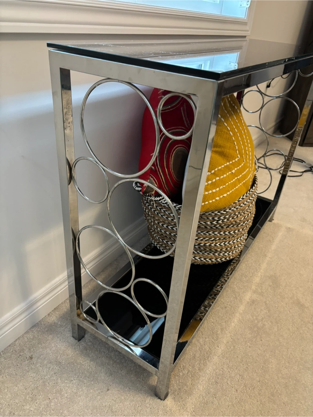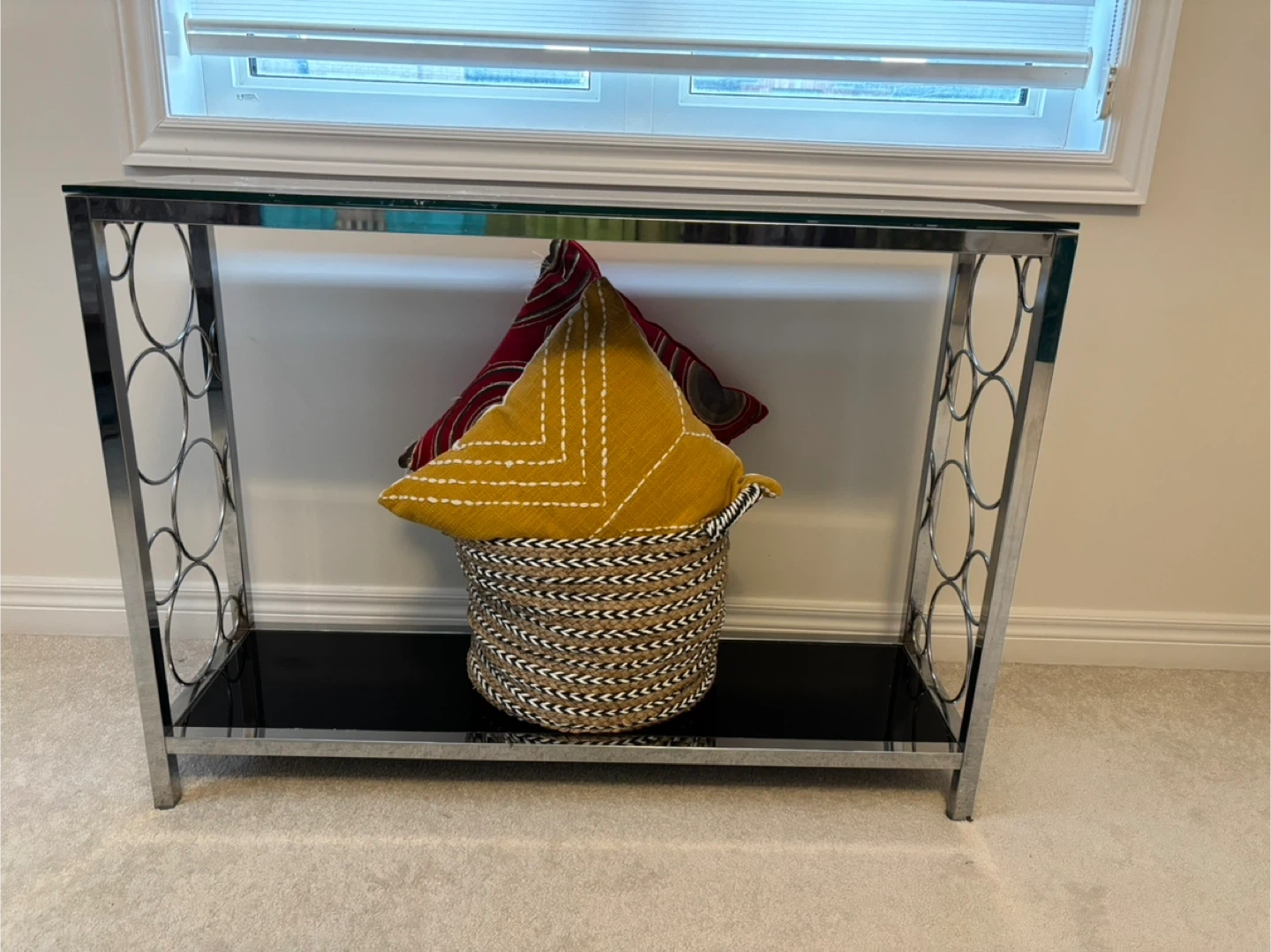 18Selling a console table with a chrome frame and a sleek glass top! It's in great shape and would look lovely in an entryway or living room. The unique circular design on the sides adds a modern touch. Perfect for displaying your favourite decor or as a stylish accent piece