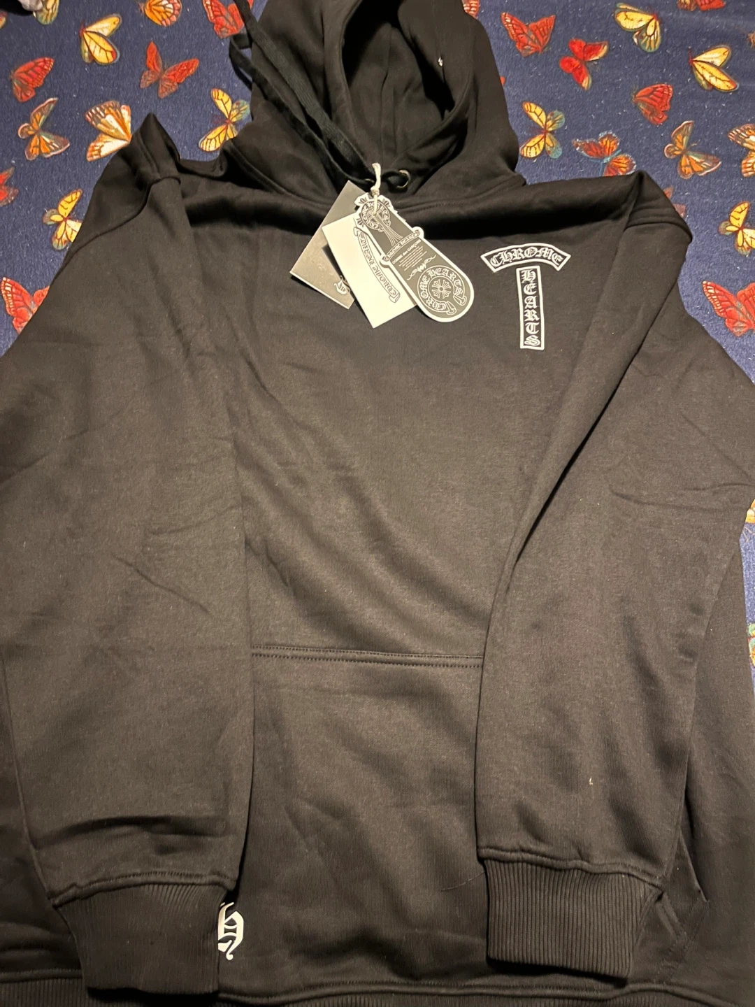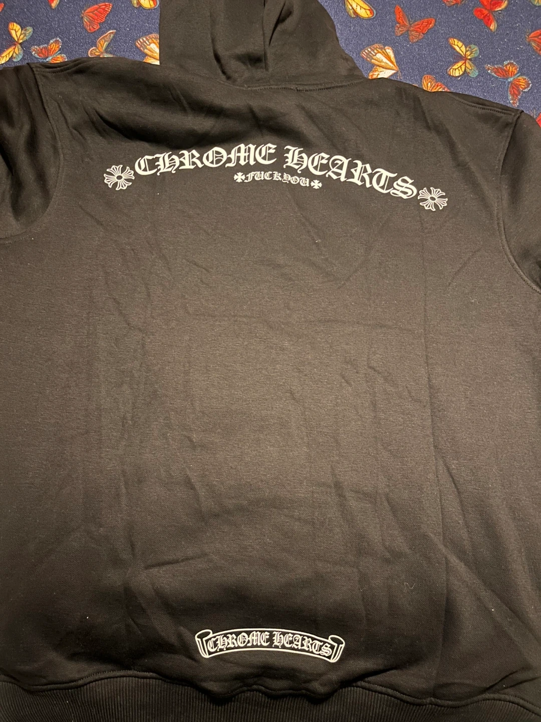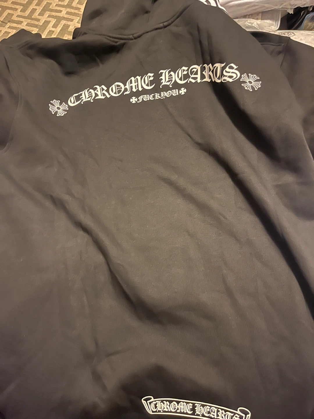 Selling a Chrome Hearts black hoodie. It's in great condition and ready for a new home! The design features the classic Chrome Hearts logo on the back and front.