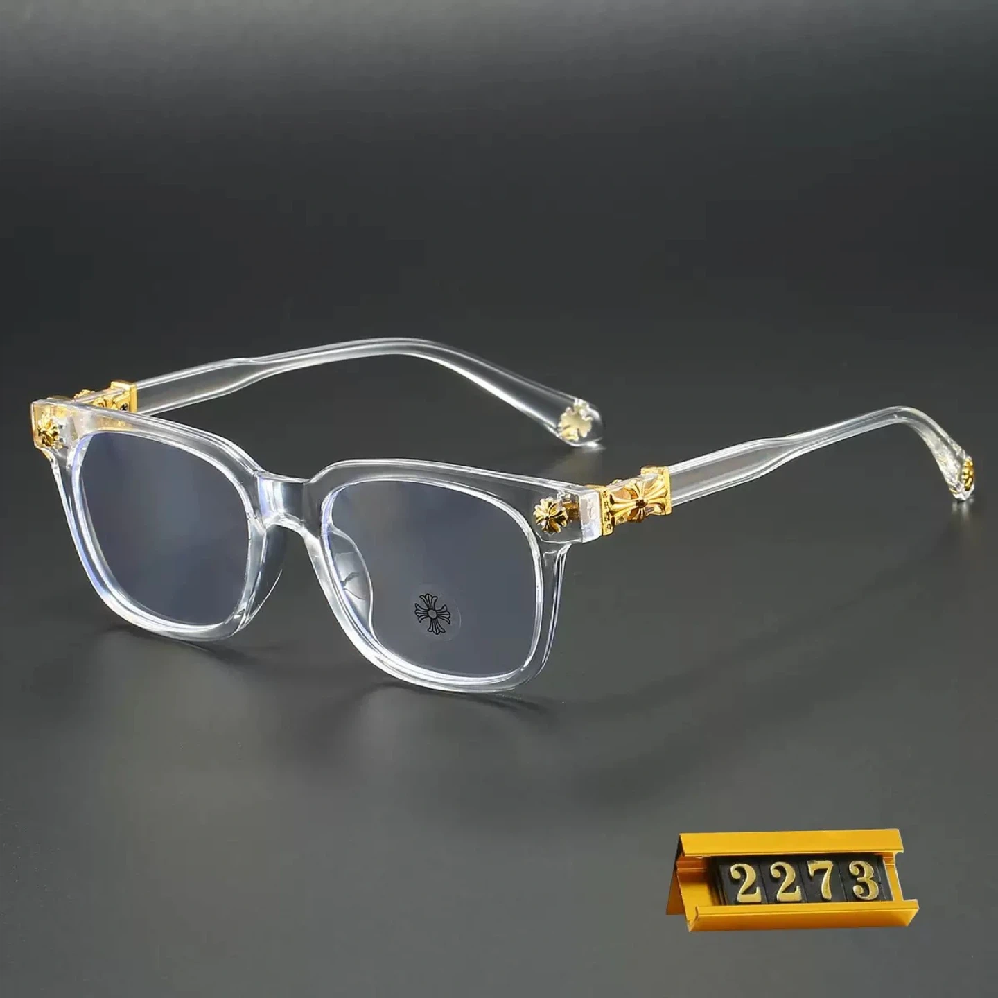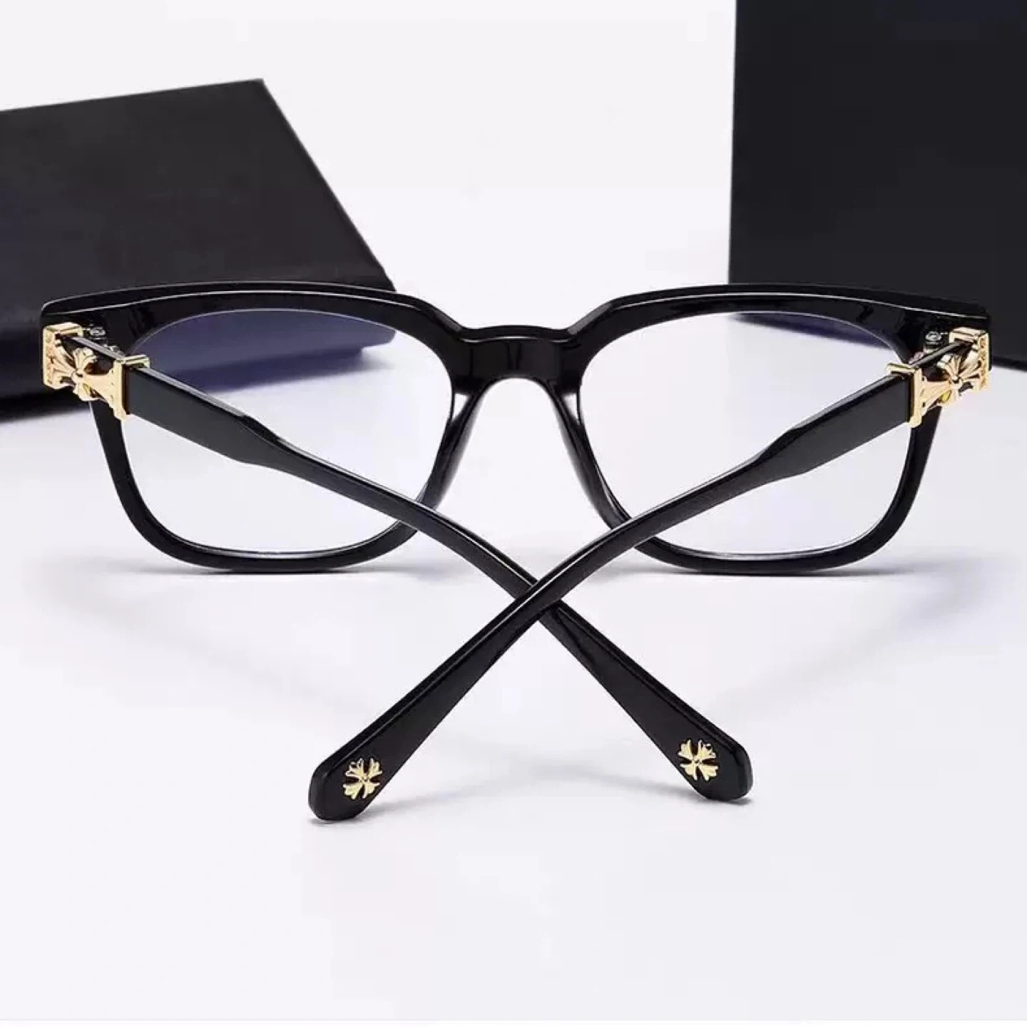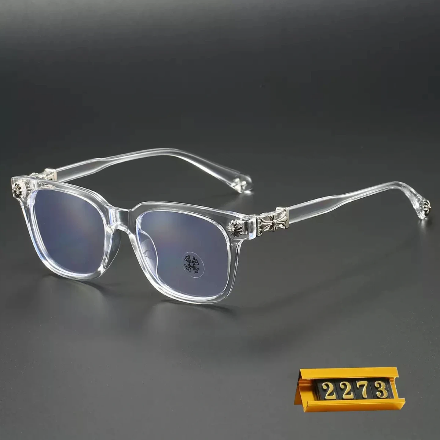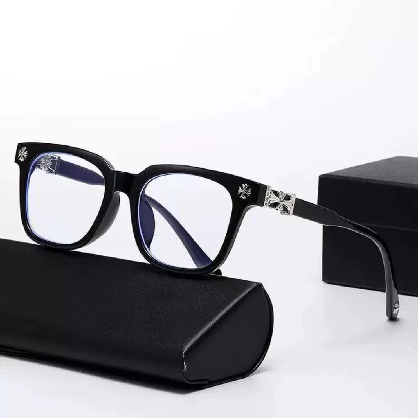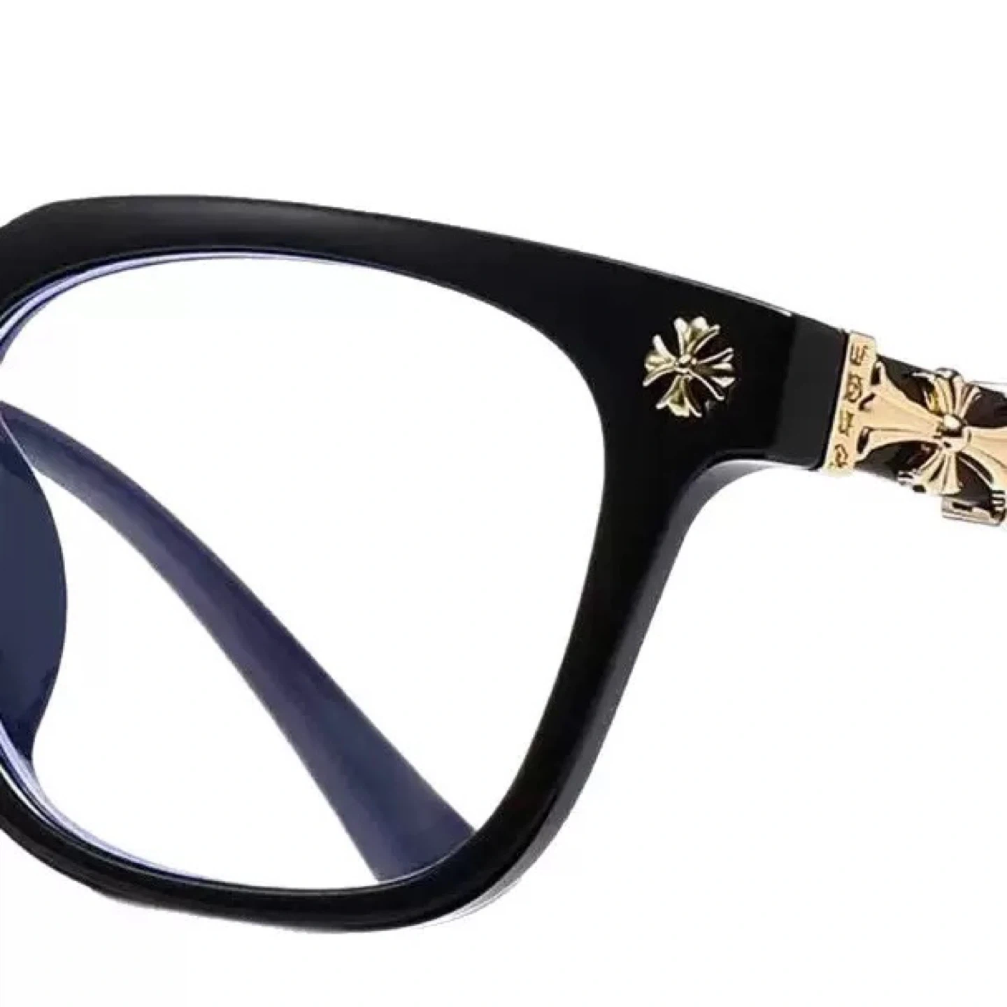 Stylish glasses with Chrome Hearts inspired design accents on the frame and temples. Available in black and clear frames.