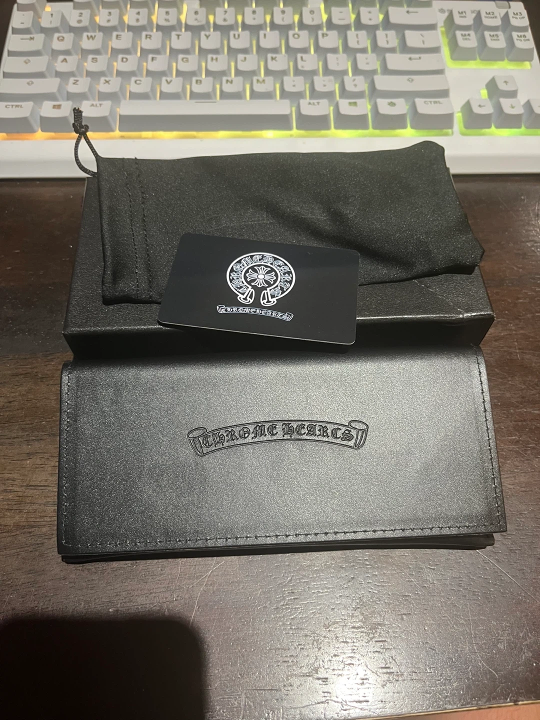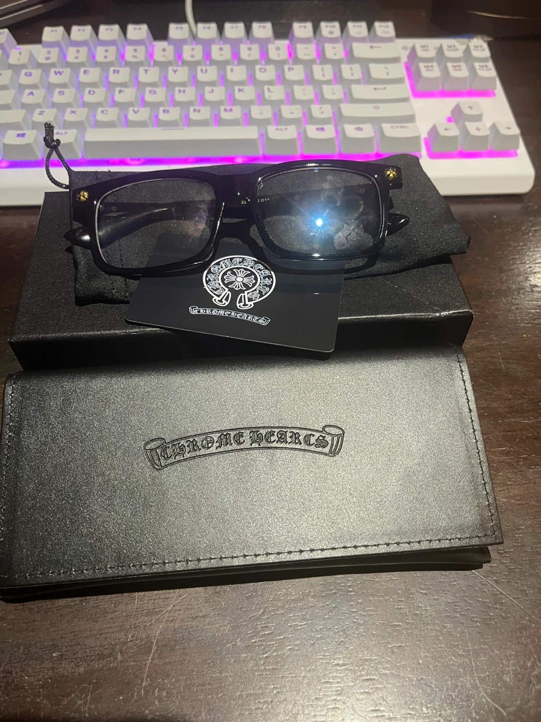 20Selling a pair of Chrome Hearts eyeglasses in black with gold accents! They come with the original box, dust bag, and card. Stylish and in great condition! Prices negotiable