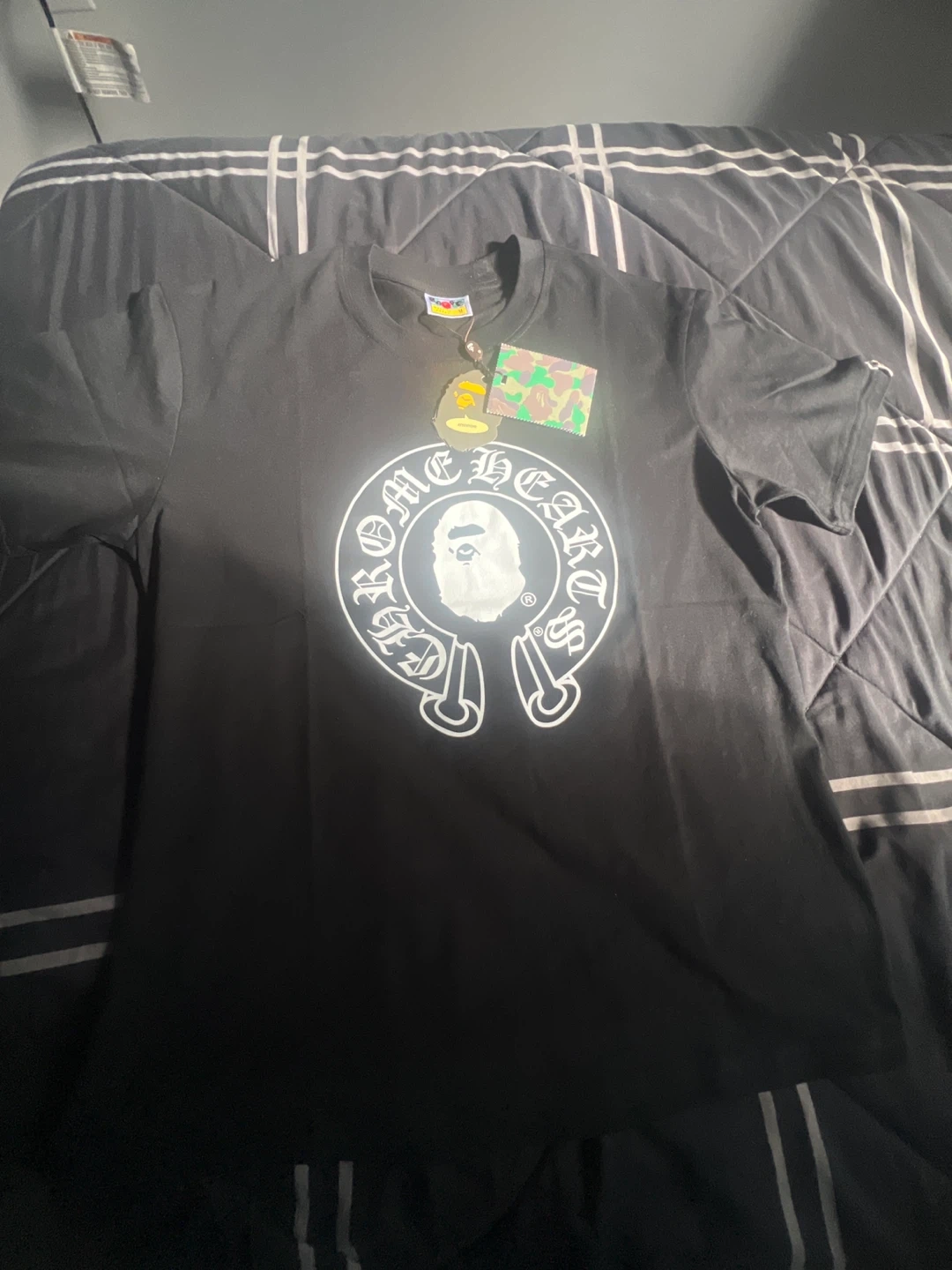 15Selling a cool Chrome Hearts x BAPE t-shirt in black! The shirt features a unique design collaboration between the two brands, with the iconic Chrome Hearts cross and BAPE's Baby Milo. It's in great condition and ready for a new home!