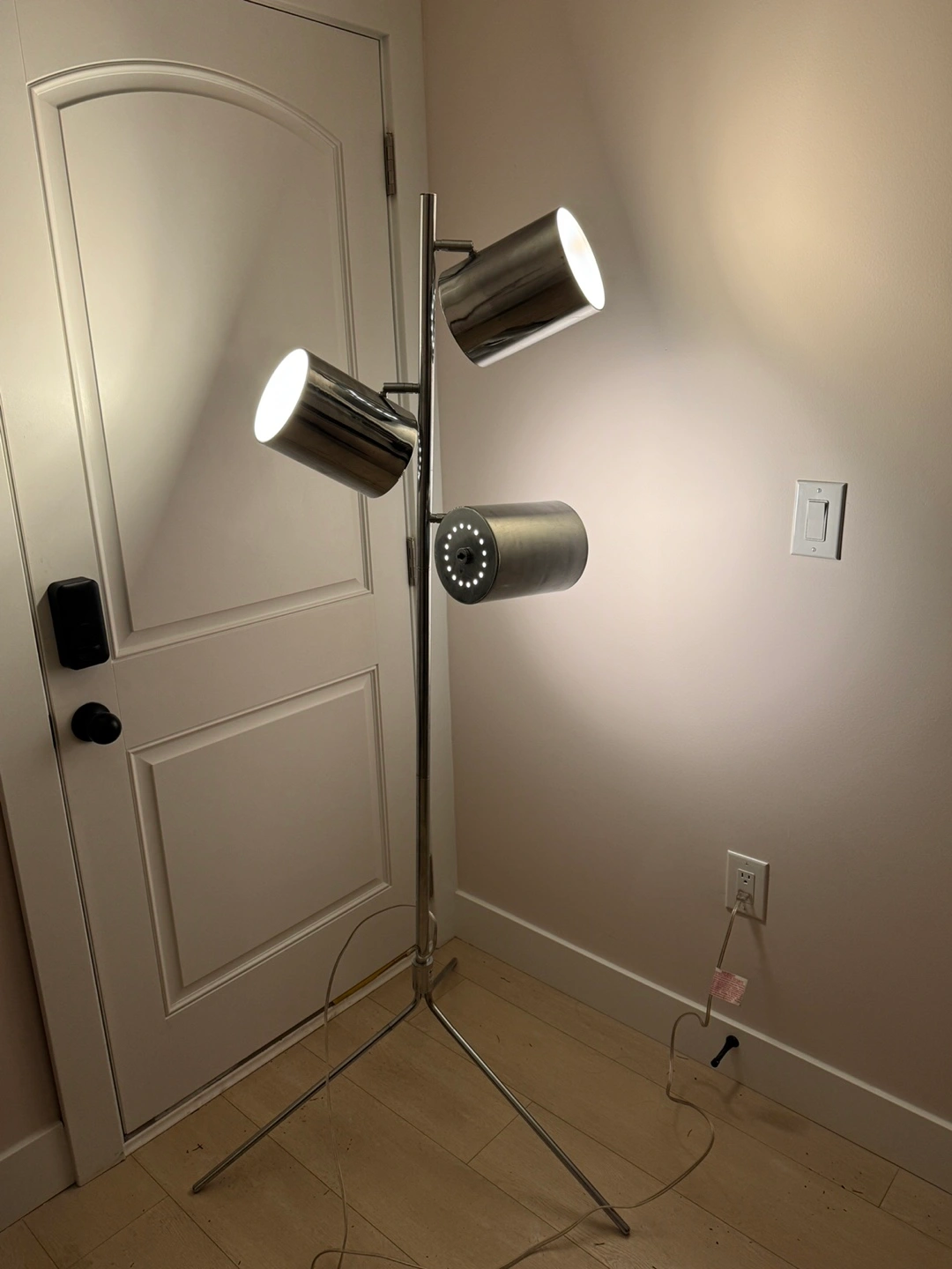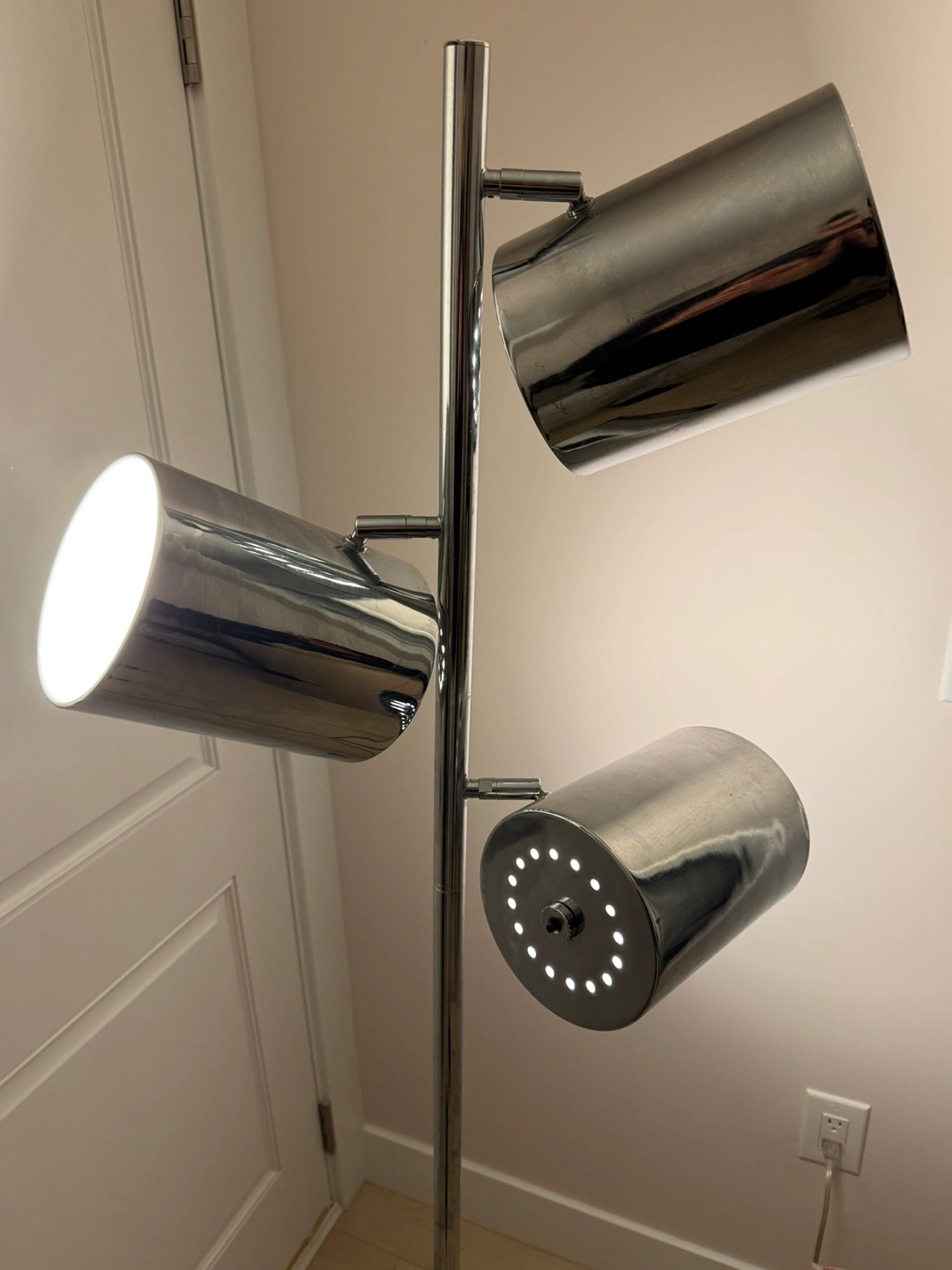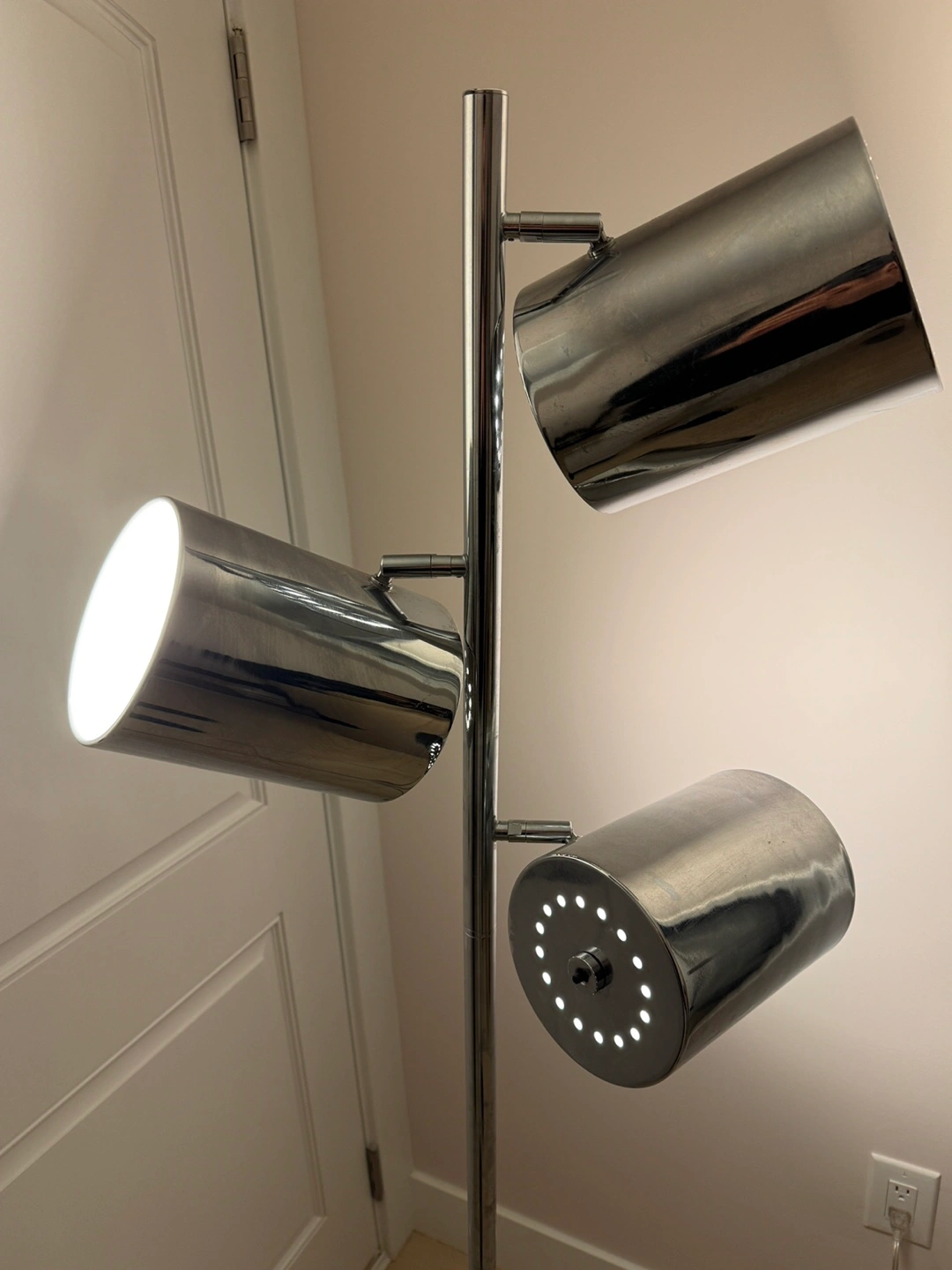 Its a stylish chrome floor lamp with multiple adjustable heads! It's in great shape and ready to brighten up your space. Perfect for adding a modern touch to any room!