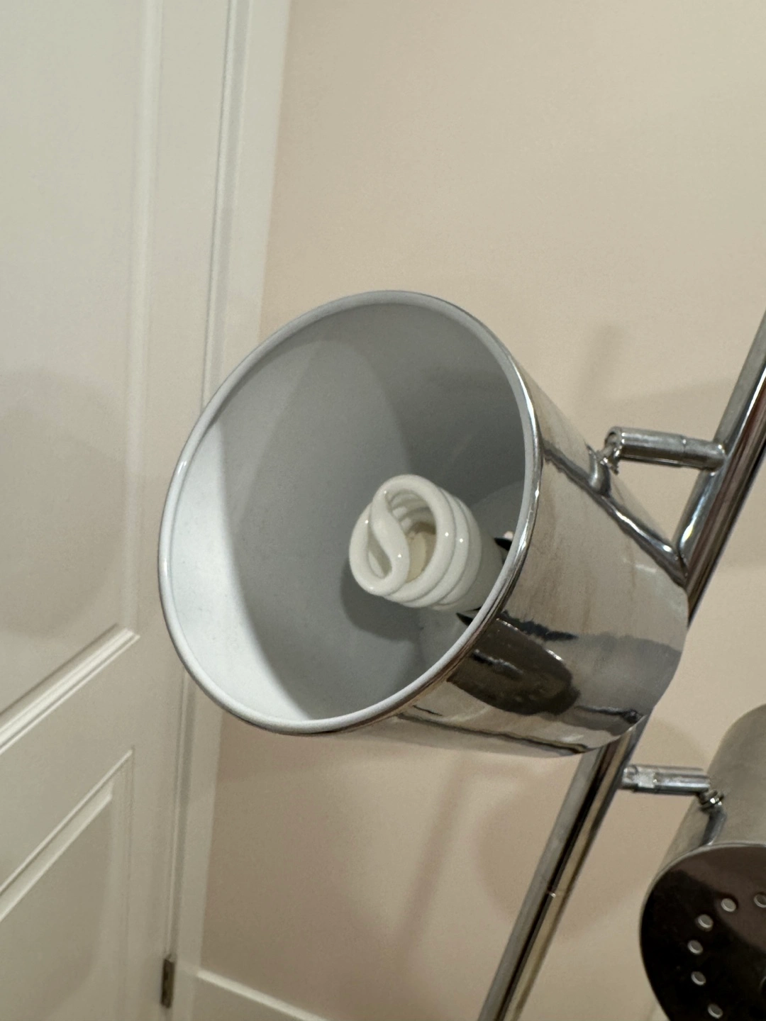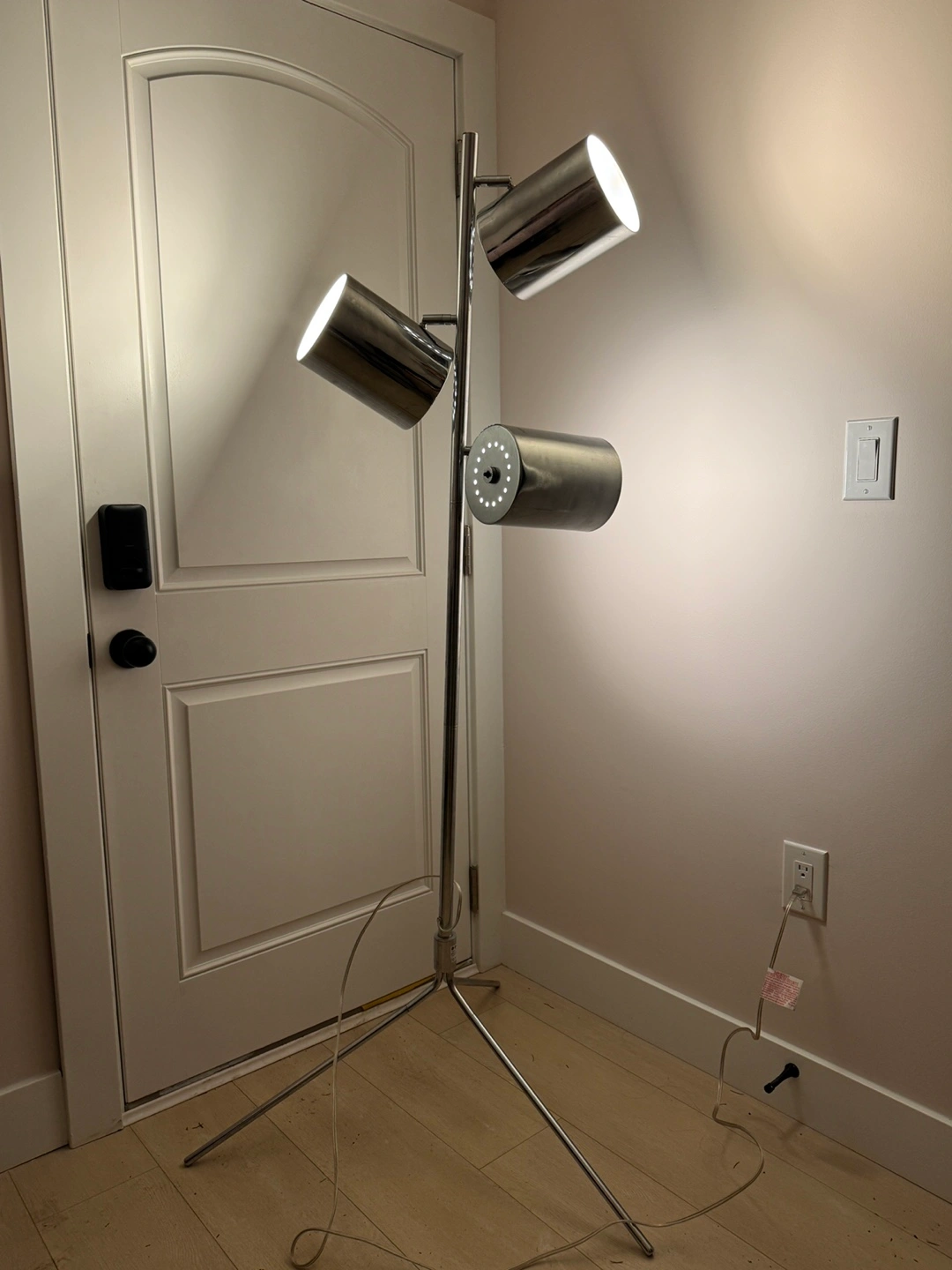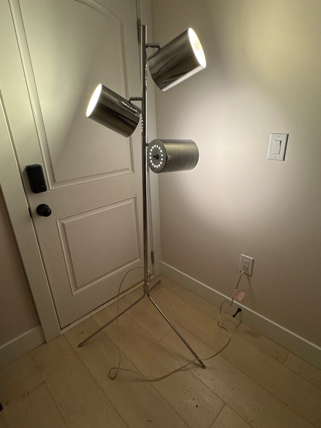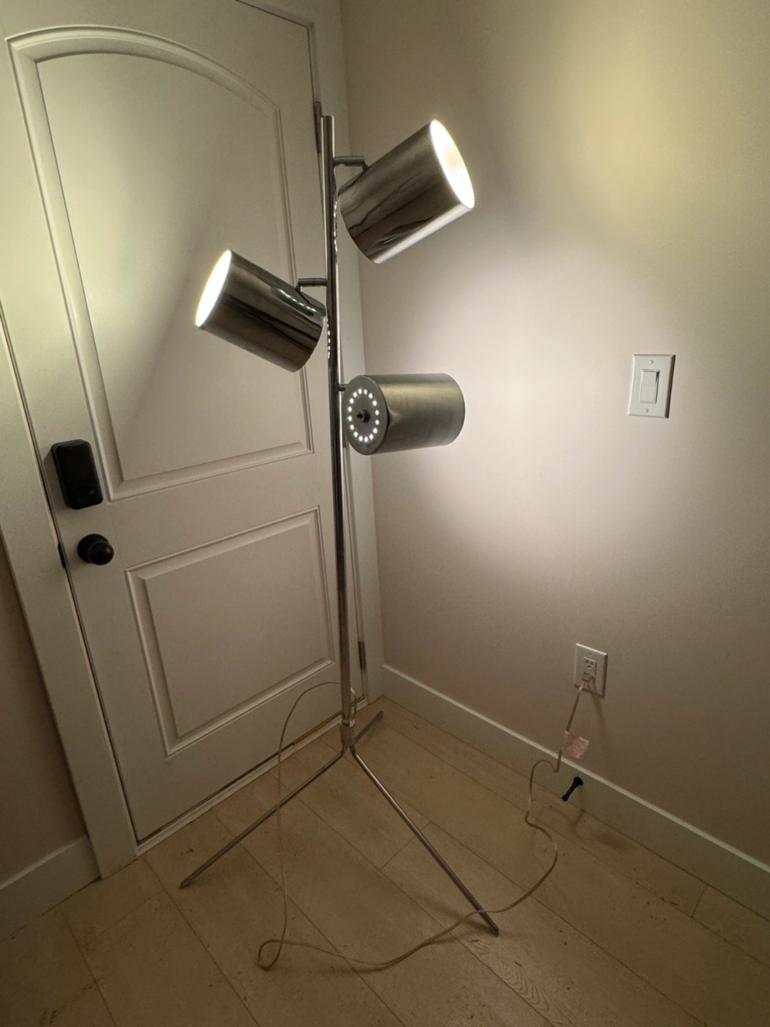Its a stylish chrome floor lamp with multiple adjustable heads! It's in great shape and ready to brighten up your space. Perfect for adding a modern touch to any room!
