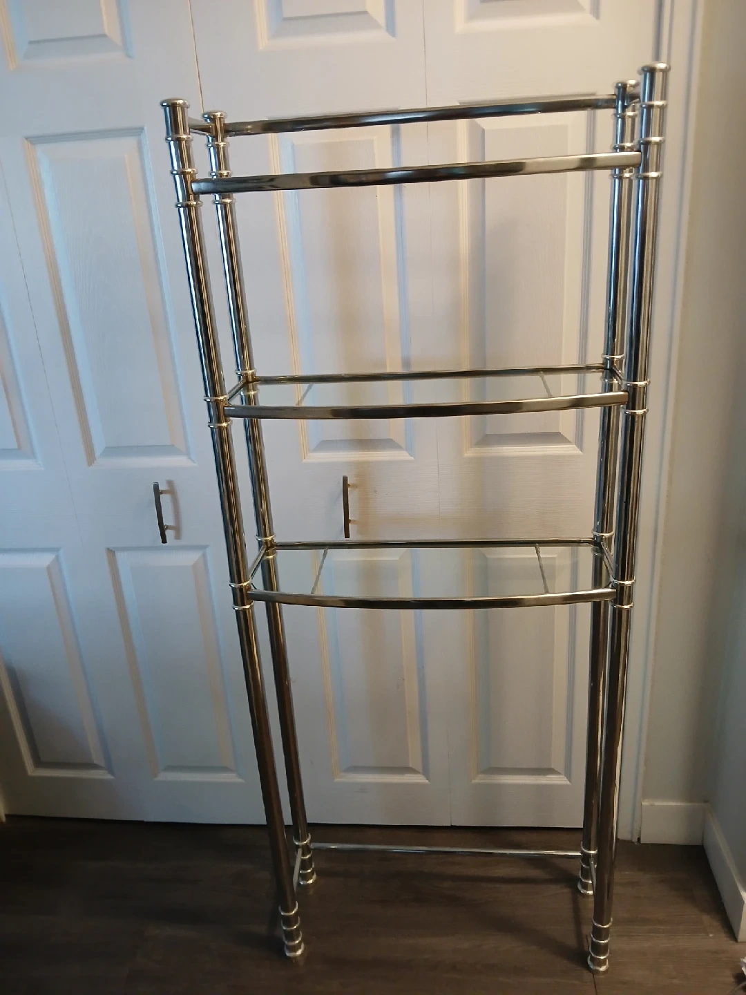 15This chrome towel rack is perfect for adding some extra storage and style to your bathroom! It features multiple bars for hanging towels and glass shelves for storing toiletries or decorative items. It's in great condition and ready for a new home