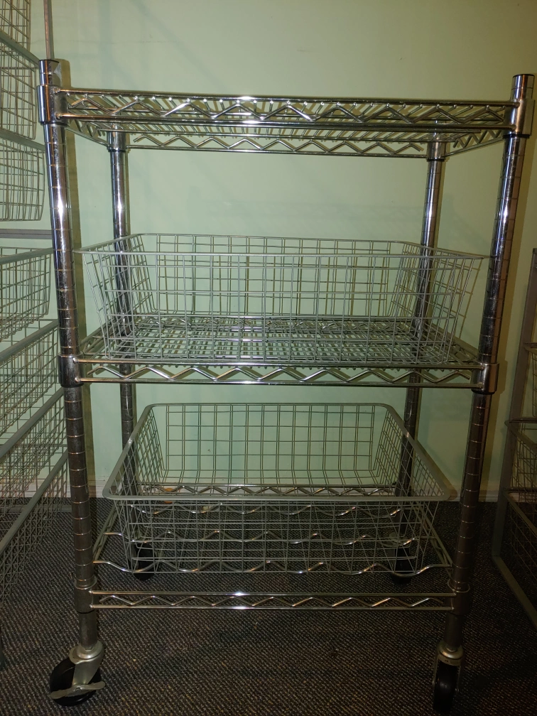 Selling a chrome wire shelving rack that comes with two wire baskets. It's on wheels, so it's easy to move around your space. Great for extra storage in a kitchen, garage, or workshop