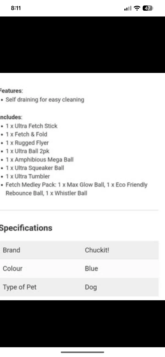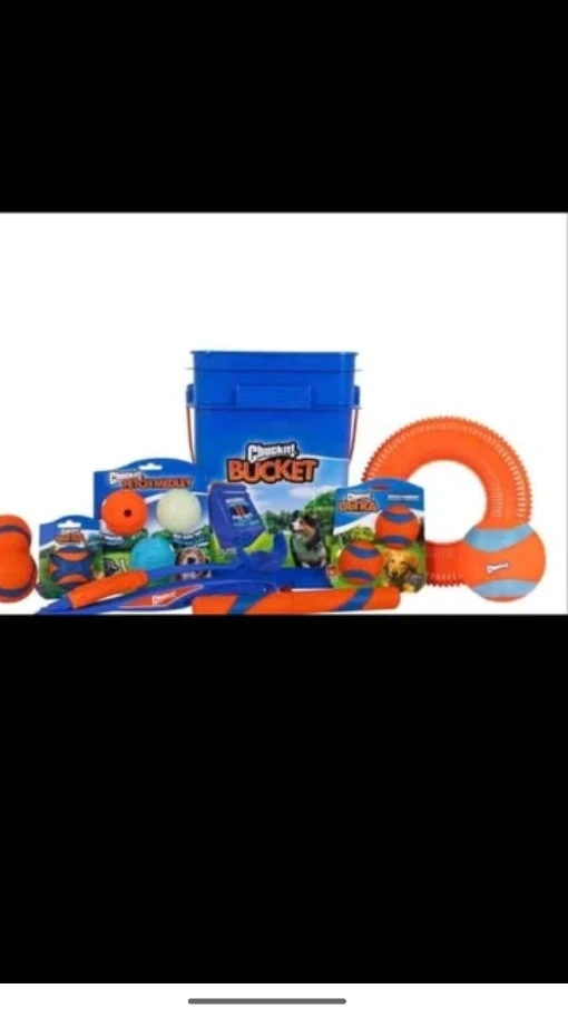 60Selling a Chuckit! dog toy bucket that includes 11 toys for your furry friend! The bucket is self-draining for easy cleaning. Included are: - 1 x Ultra Fetch Stick - 1 x Fetch & Fold - 1 x Rugged Flyer - 1 x Ultra Ball 2pk - 1 x Amphibious Mega Ball - 1 x Ultra Squeaker Ball - 1 x Ultra Tumbler - Fetch Medley Pack: 1 x Max Glow Ball, 1 x Eco Friendly Rebounce Ball, 1 x Whistler Ball