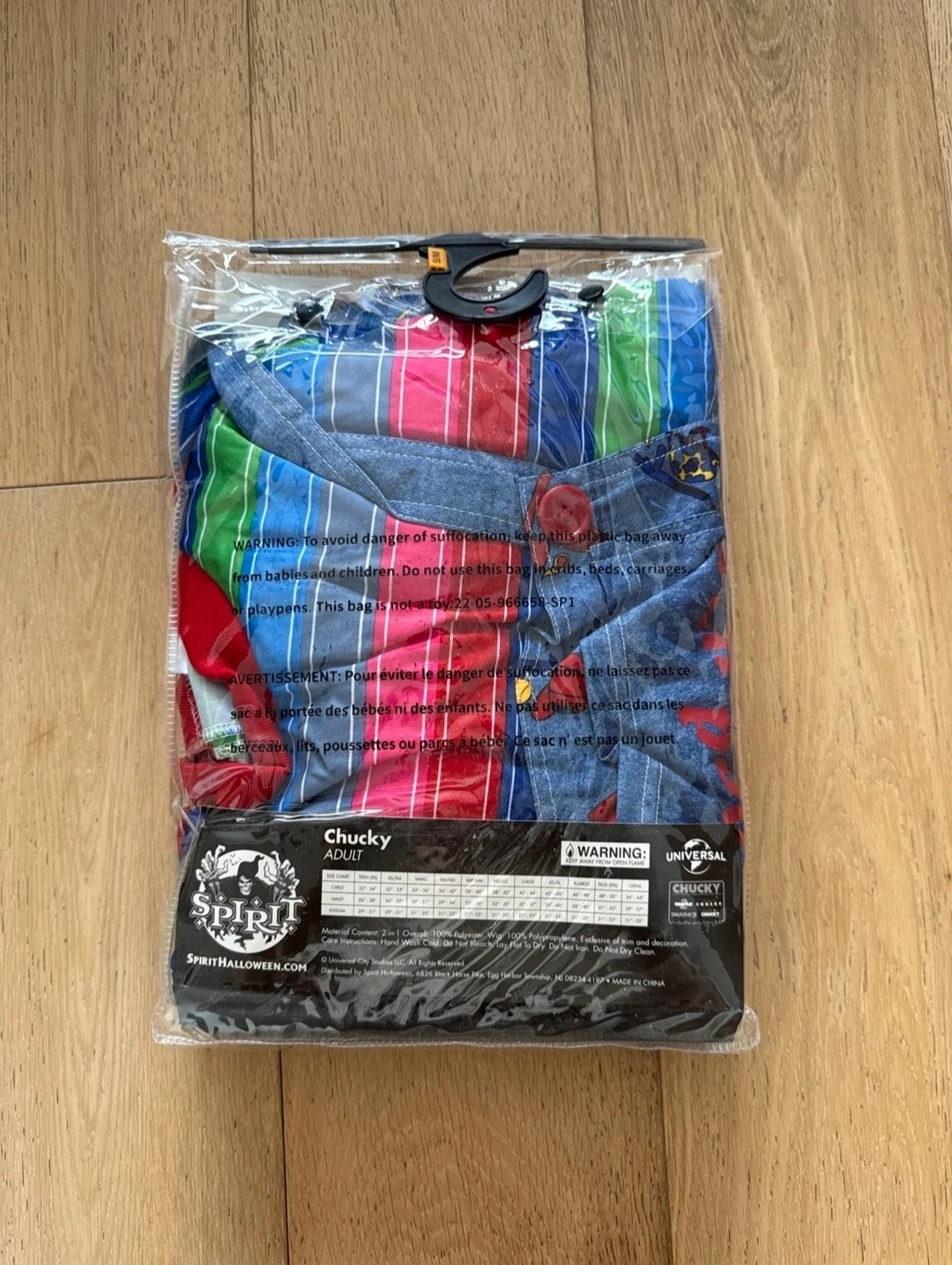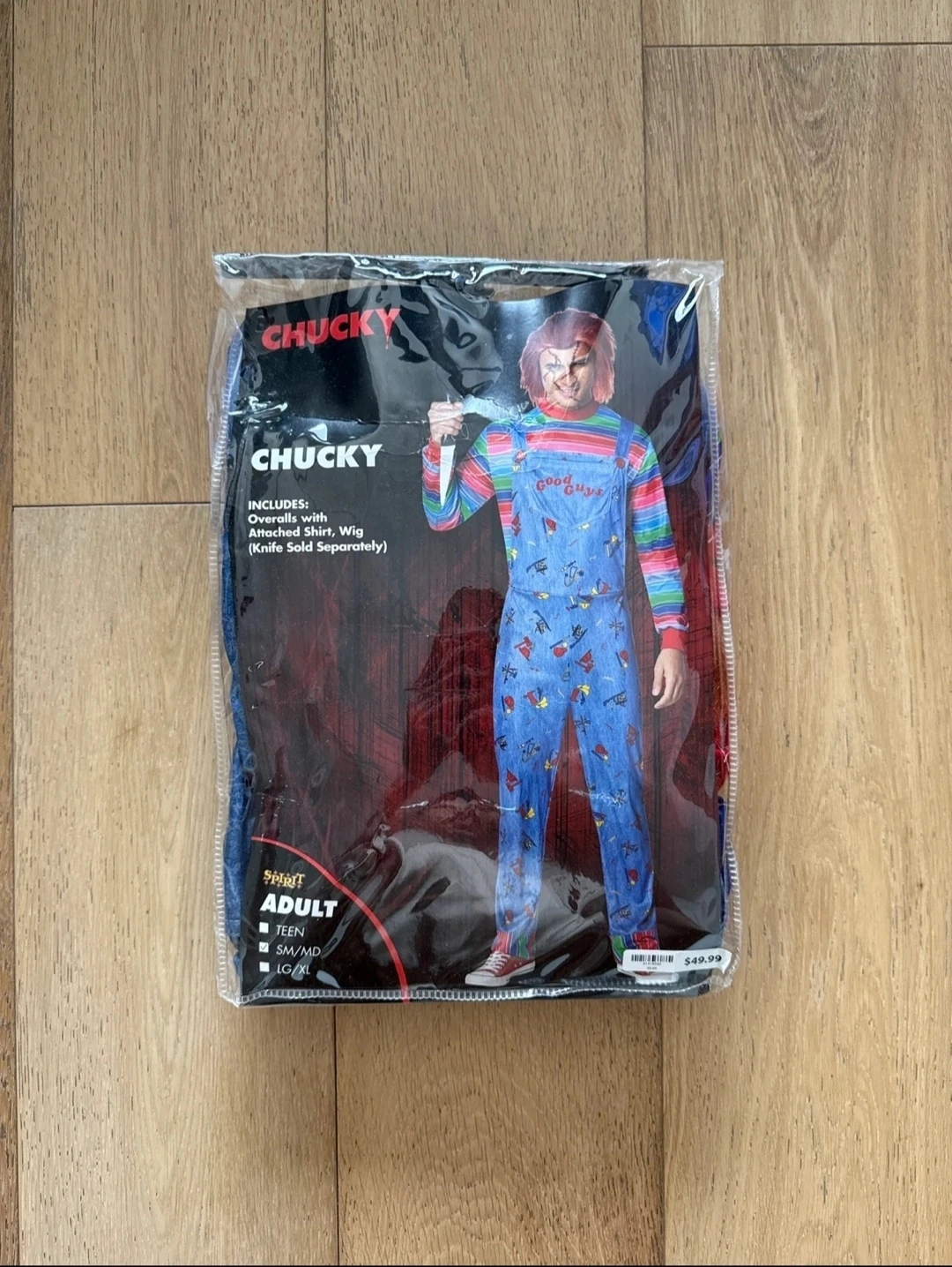 98Get ready for Halloween with this Chucky costume! It's an adult size and includes the overalls with attached shirt. The knife is sold separately. Material Content: 100% Polyester. Contains wig.