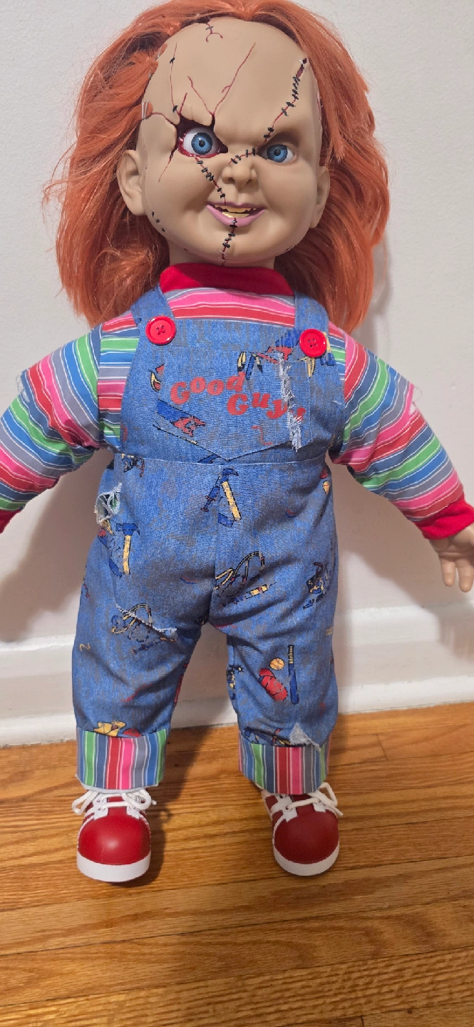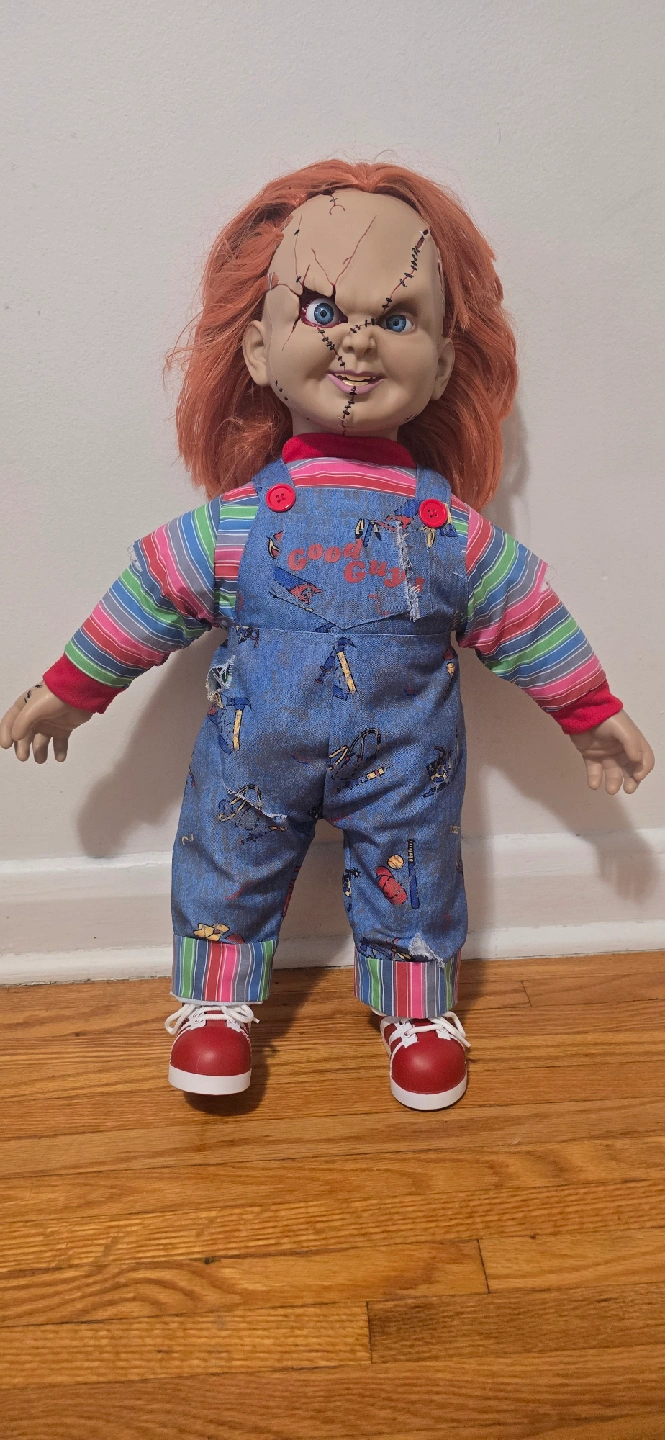 5Selling a Chucky doll replica from the movie Child's Play. This doll is in great condition and would be perfect for any horror fan or collector! The doll is wearing his signature overalls and striped shirt.