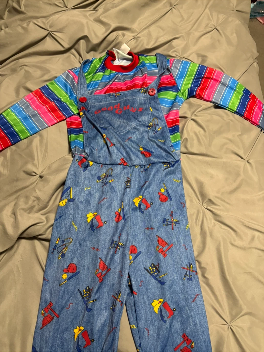 Selling a Chucky Good Guys costume in teen size! The costume features the iconic striped shirt and overalls with the 'Good Guys' logo. Perfect for Halloween or cosplay!