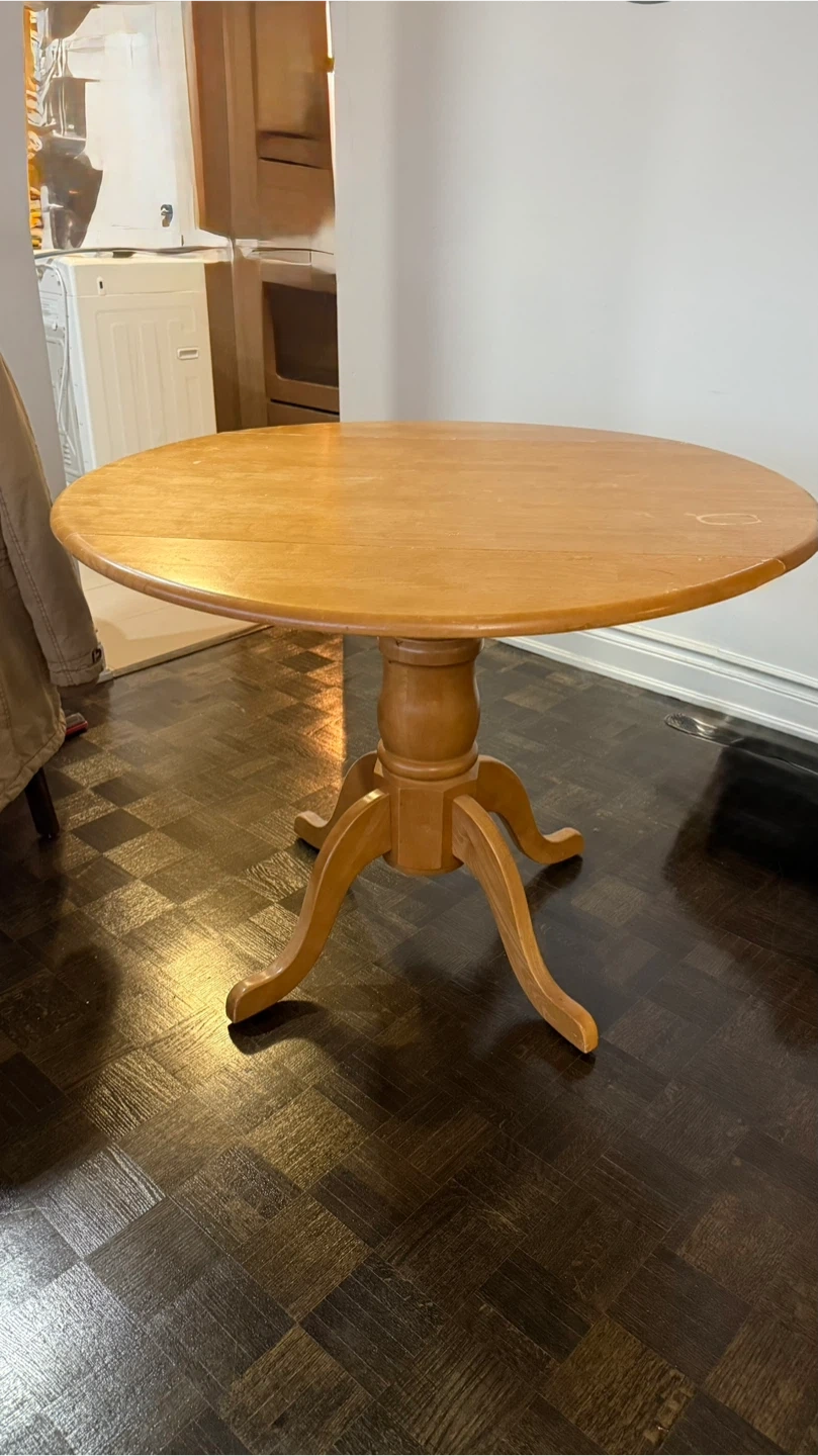Light wood drop leaf dining table. The table has a round pedestal base and can be extended by dropping the leaves. Seats up to four people when extended. 100cm Diameter