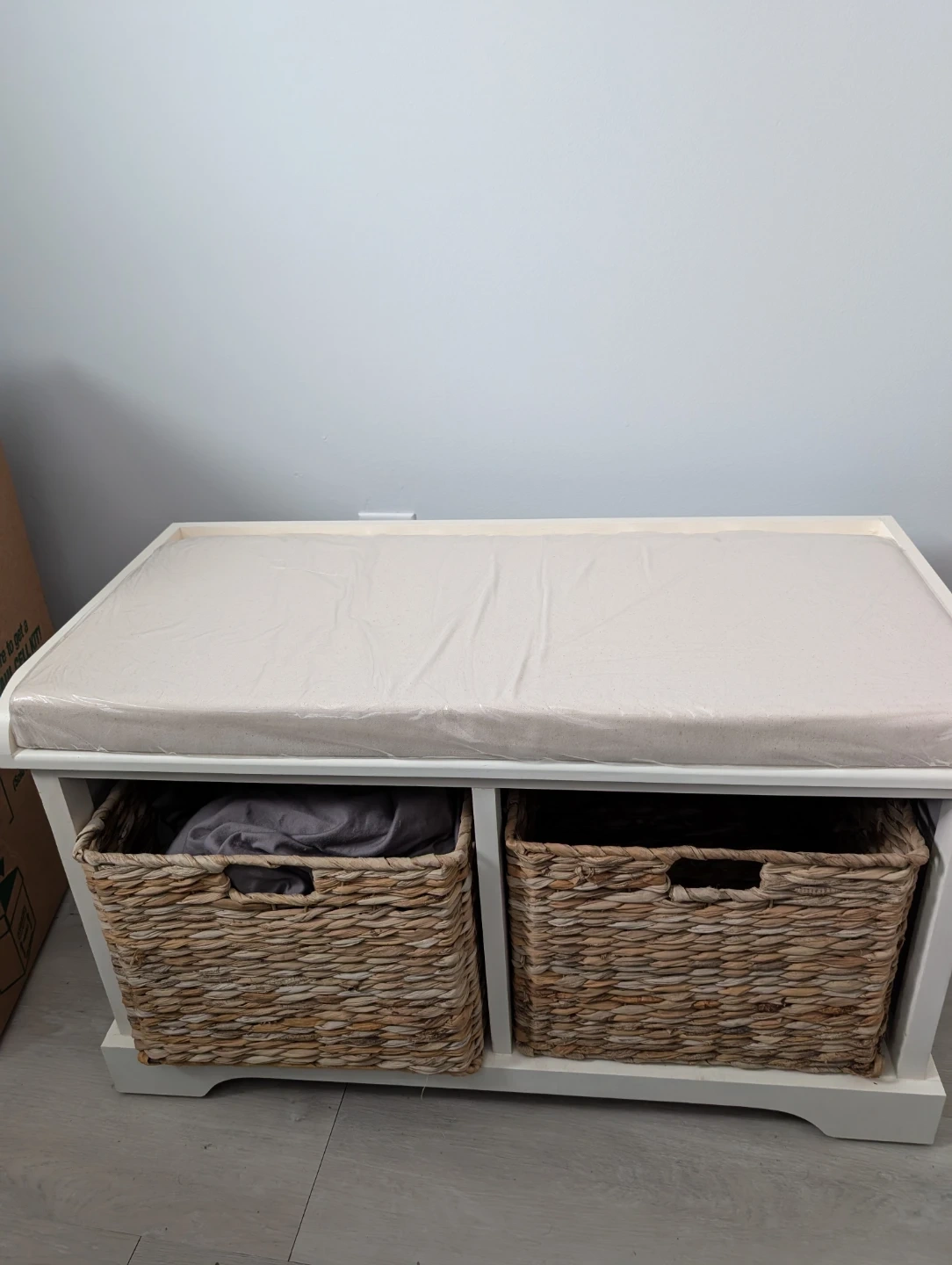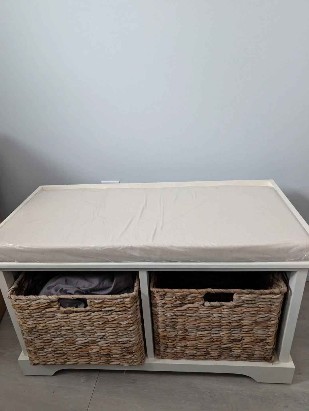 White Storage Bench with Woven Baskets