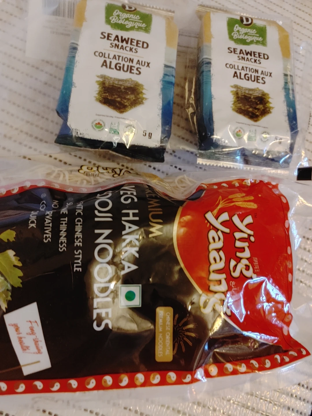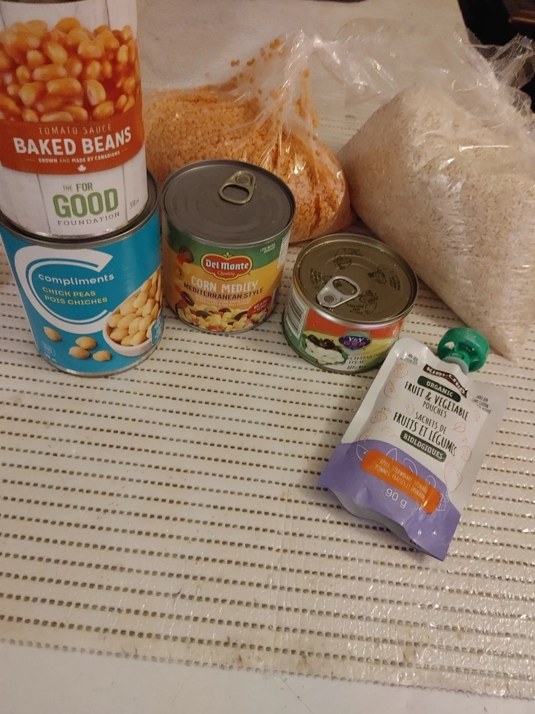 Bundle includes a can of baked beans, chickpeas, corn medley, and a pouch of fruit & vegetable puree. Also includes a bag of red lentils and a bag of white rice. 2 paks seaweed and noodles Great for stocking your pantry! Nothing expired