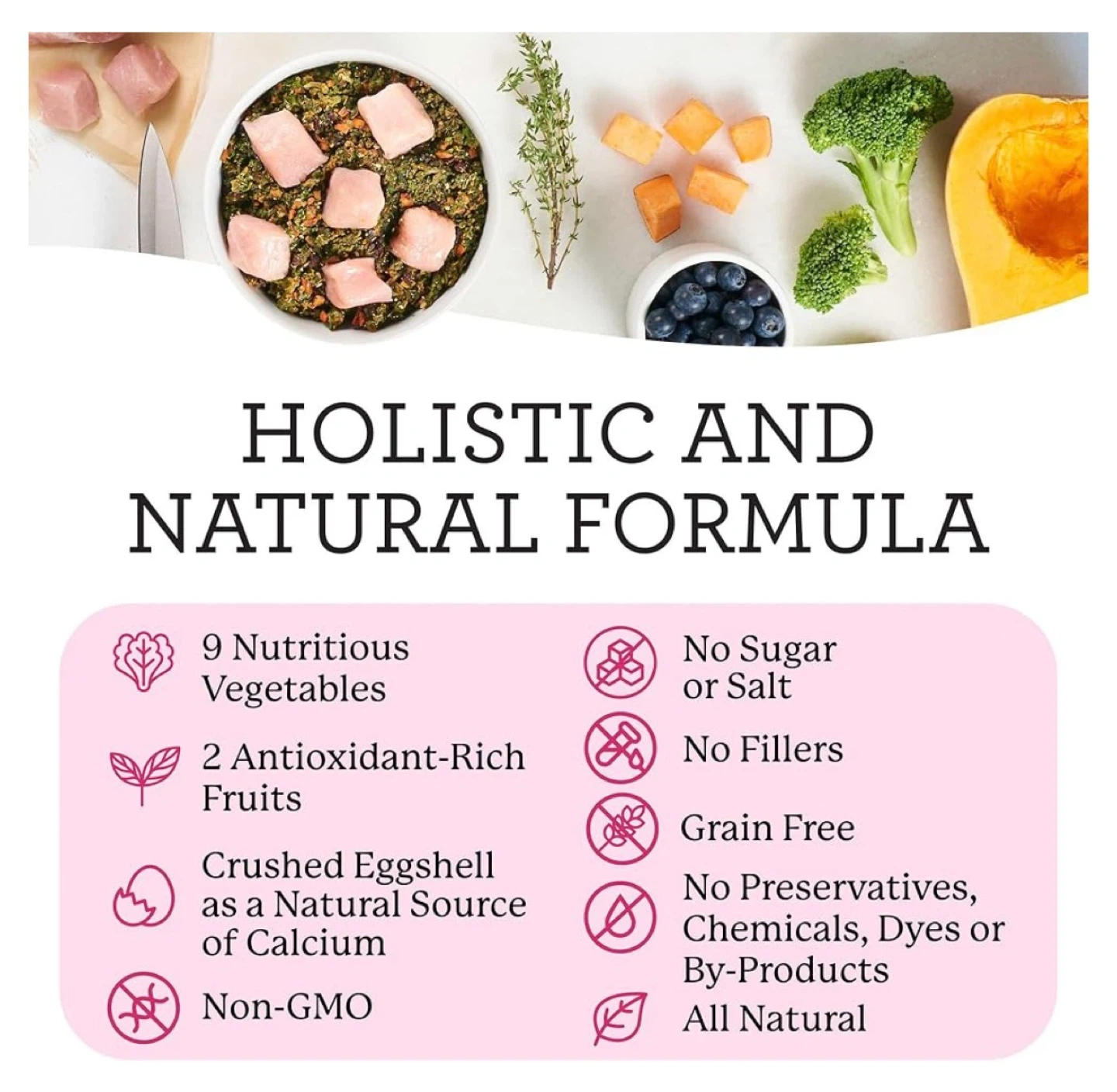 Dr. Harvey's Raw Vibrance is a grain-free foundation mix for raw / cooked dog diets. It's made with 9 nutritious vegetables and 2 antioxidant-rich fruits. This 3 lb bag makes 28 one-pound meals, providing a holistic and natural formula for your furry friend.