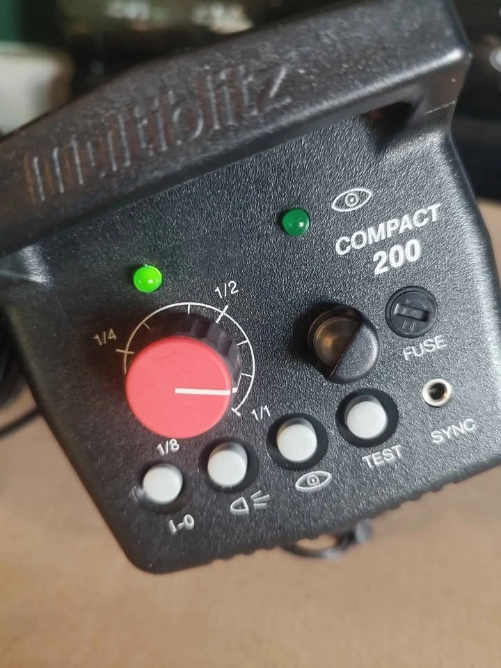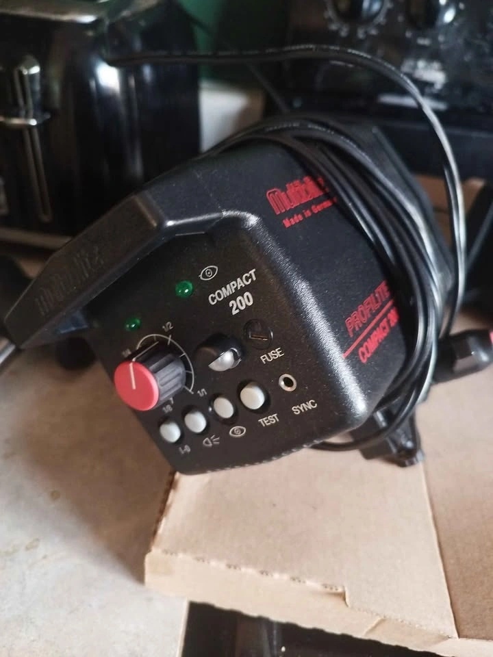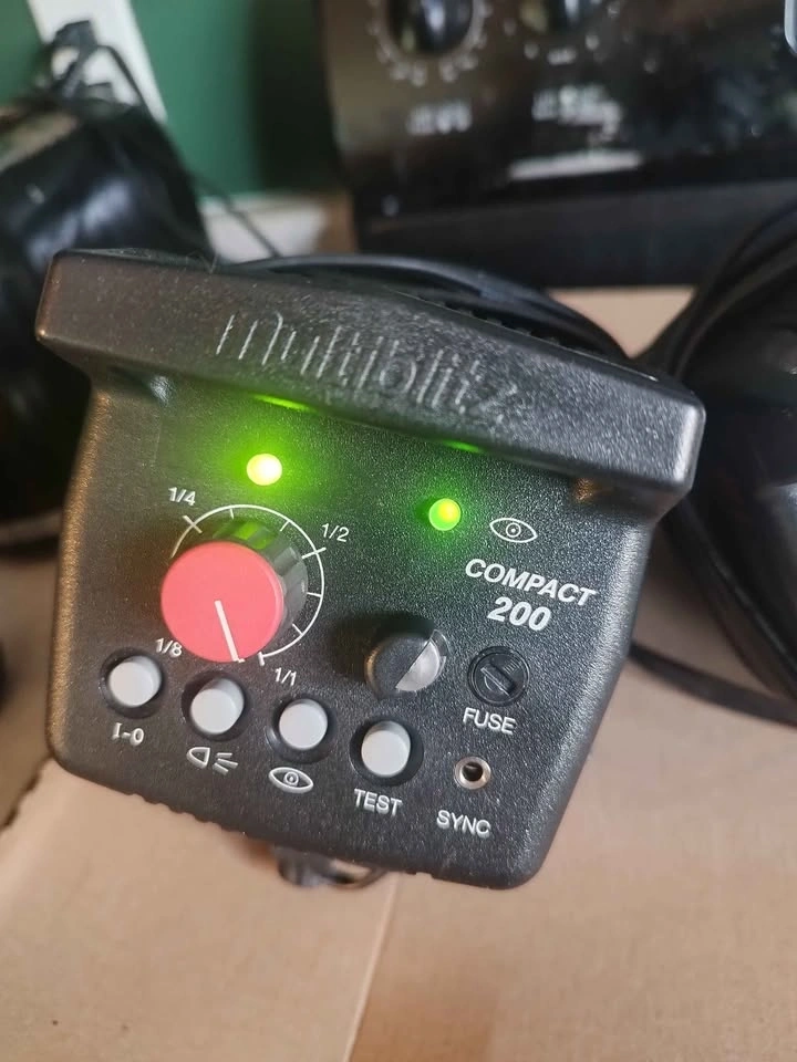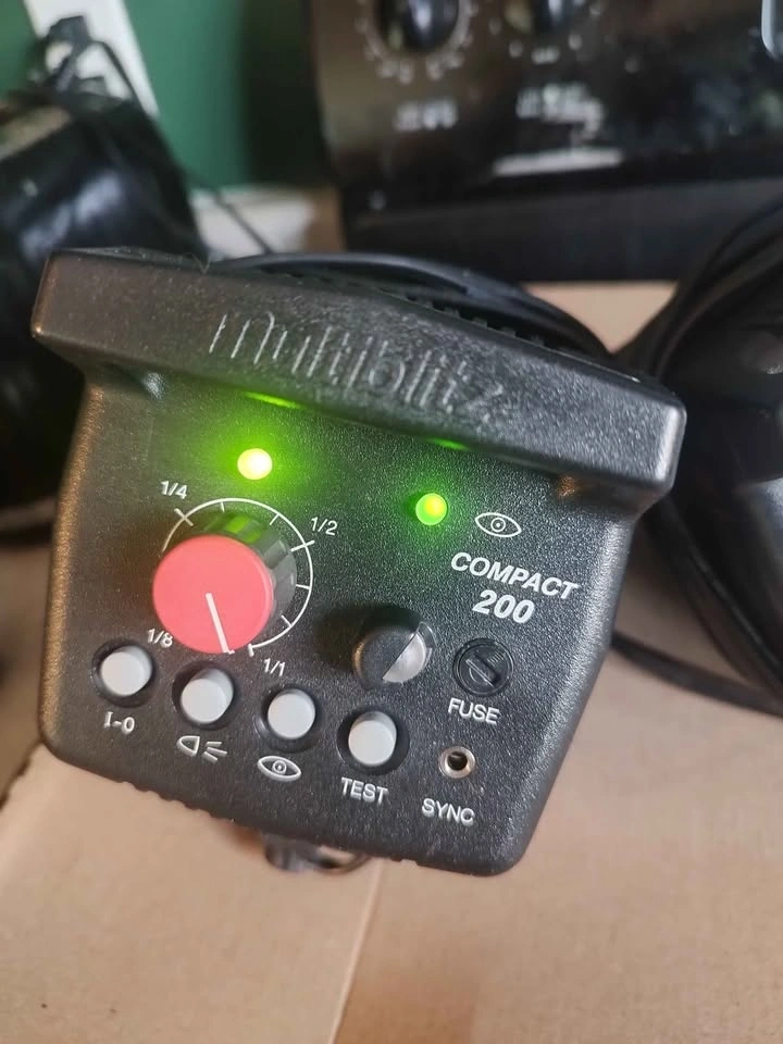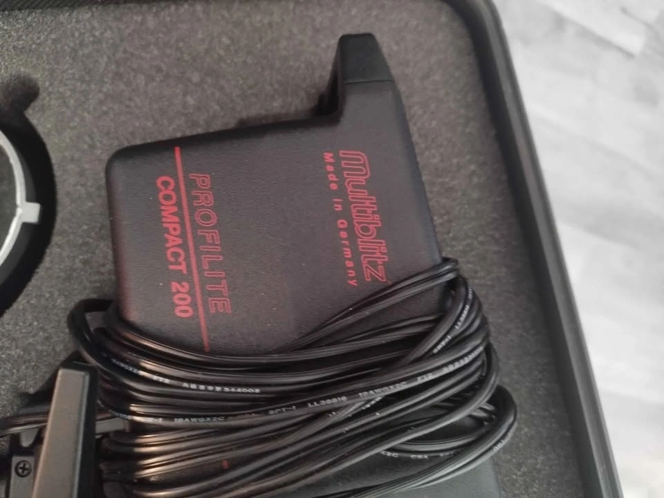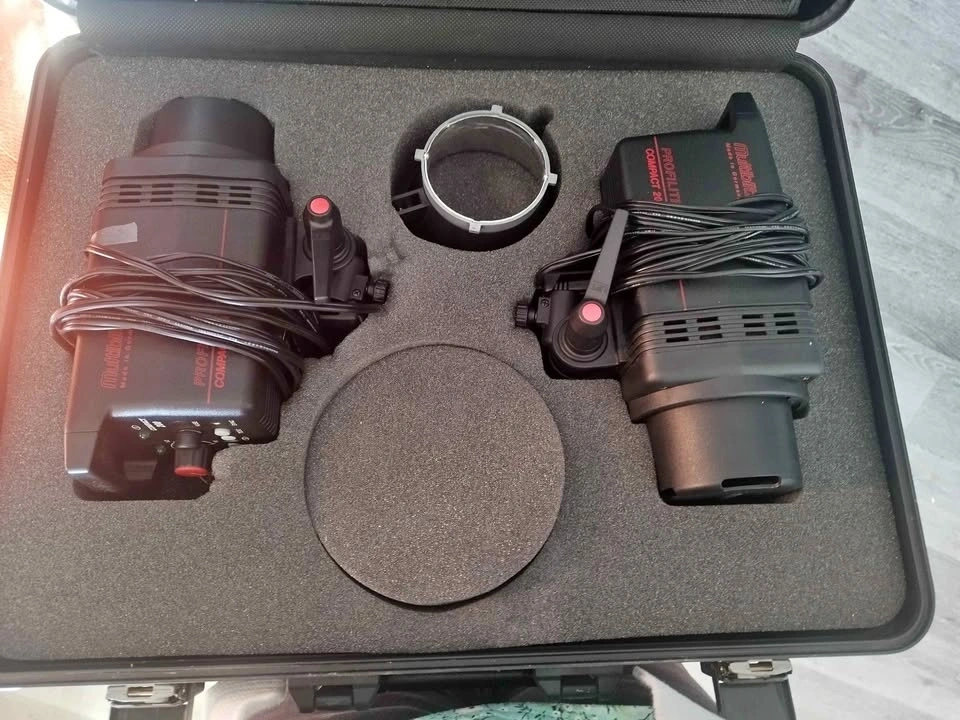 Complete Multiblitz Profilite Compact 200 studio strobe kit. Includes two strobes and a hard case for easy transport and storage. Also has a silver accessory ring in the case. Great for photography lighting setups. Pick up in Spruce Grove.