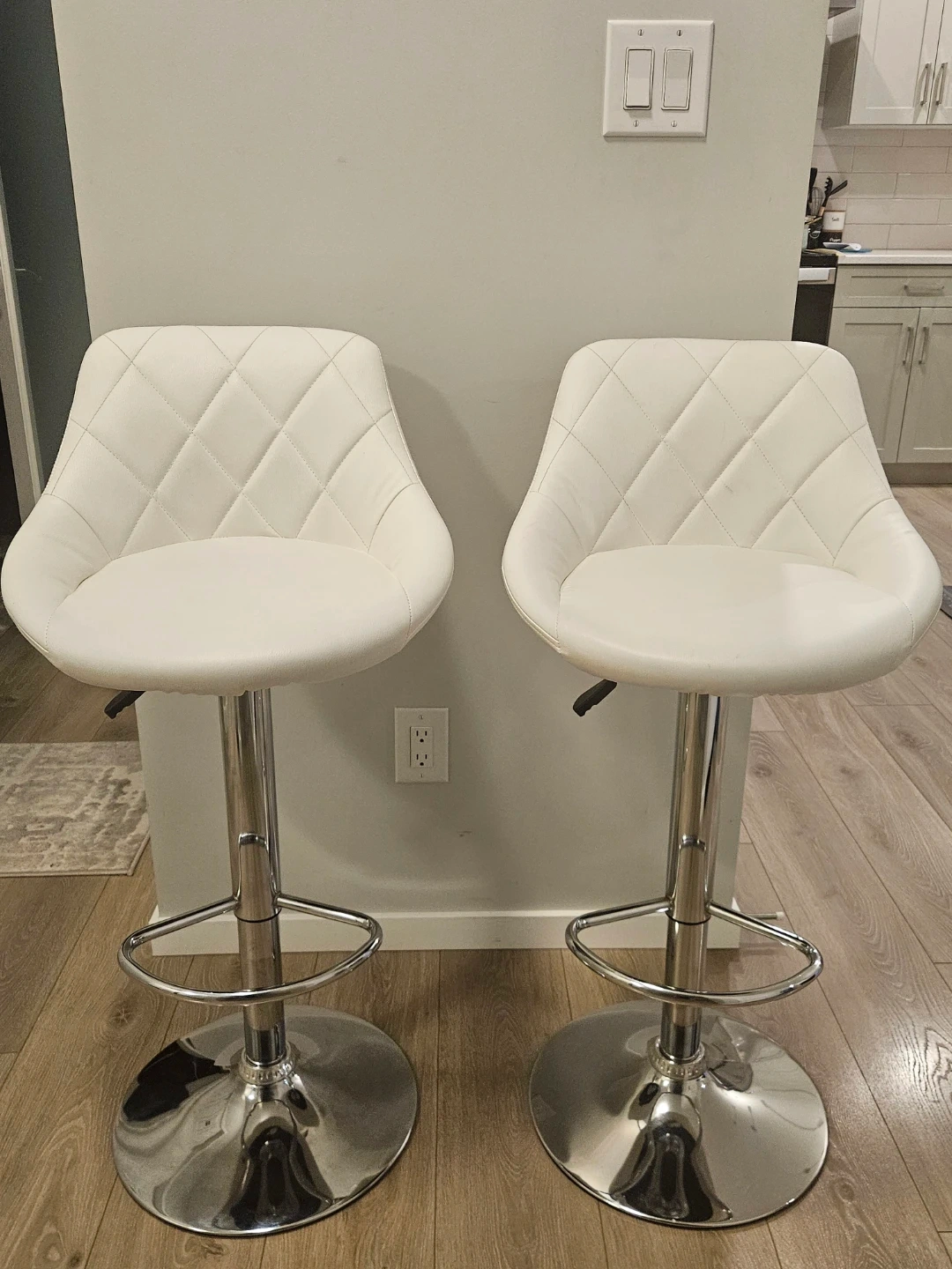 This set includes two white bar stools with a diamond-stitched faux leather seat. They feature a chrome base and adjustable height for convenience. These stools would be great for a kitchen island or home bar area!